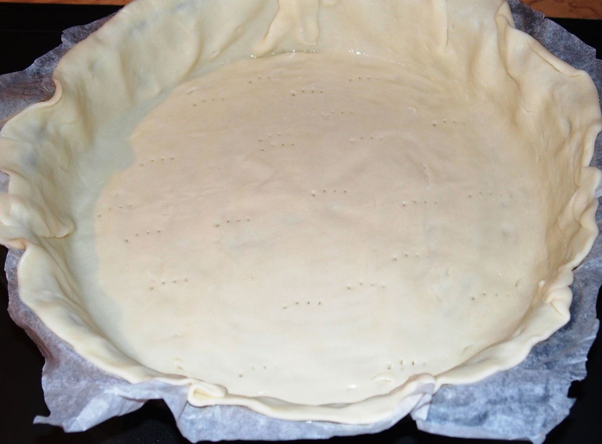 3) Foncer le moule à tarte avec la pâte abaissée. Moi, je laisse le papier sulfurisé. Sinon, beurrer et fariner le moule à tarte avant d'y déposer la pâte. Bien appuyer sur la pâte sur tout le tour du moule afin qu'elle adhère bien. La coller presque contre les bords (sinon elle va se rétracter et retomber dans le moule). Ainsi que sur le contour du fond qui fait angle droit avec les bords. Piquer avec une fourchette le fond. Dans un grand récipient, casser les oeufs. Tremper un pinceau à pâtisserie uniquement dans le blanc et badigeonner le fond de la tarte au pinceau avec le blanc (l'équivalent d'une cuillère à soupe). Enfourner dans le bas du four préchauffé à 220°C sur la grille pour 7 minutes. Si la pâte lève en cours de cuisson, ouvrir la porte du four et piquer avec une fourchette.