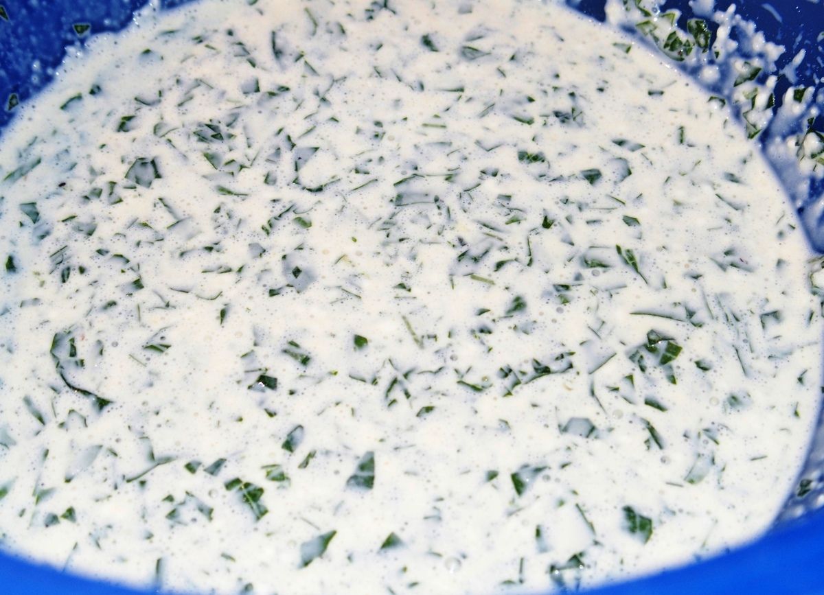 4) Dans le récipient contenant les oeufs que vous avez cassés, ajouter le lait, la crème et la farine. Mélanger au fouet. Ciseler le basilic et ajouter. Saler (1/2 càc environ) et poivrer. Mélanger. Couper les bûches en tranches assez fines, afin de pouvoir recouvrir la tarte.