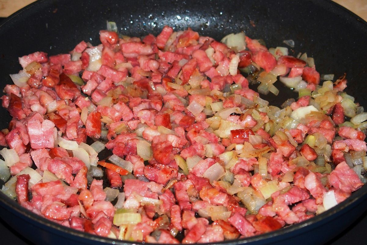 2) Dans une poêle chaude, faire revenir les lardons sans matière grasse à feu vif durant 3 à 4 minutes. Ajouter l'oignon haché et faire revenir encore 1 minute. Réserver et laisser tiédir.