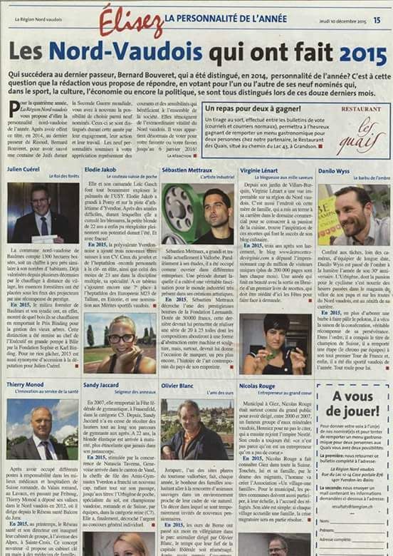 Le journal "La Région Nord vaudois" a proposé dans son tous-ménages de jeudi les 9 "personnalités" du nord vaudois qui ont fait l'année 2015. Et j'y suis, c'est cool non? Bon, c'est bien sympa tout cela, mais pour que je sois élue, il faut VOTER. Et oui. Un peu comme à "La Nouvelle Star". Faut que je continue l'aventure quoi. Toute personne résidant en Suisse a le droit de voter. Oui uniquement les personnes résidant en Suisse, je sais, c'est moche!