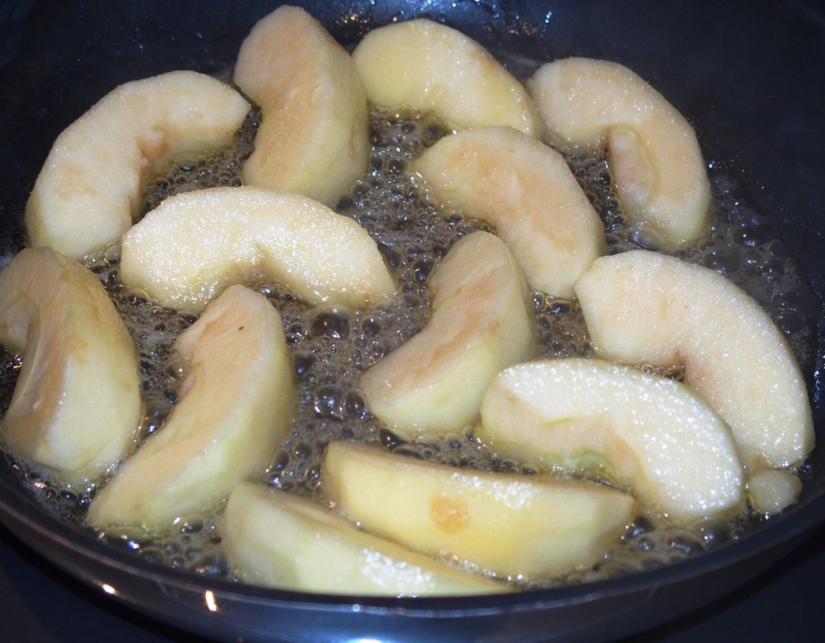 2) Peler les pommes, enlever le centre et les découper en quartiers. Dans une poêle, faire fondre le beurre et ajouter les quartiers de pommes. Ajouter le miel et le vinaigre de cidre. Faire caraméliser sur feu moyen une vingtaine de minutes en les retournant de temps en temps.