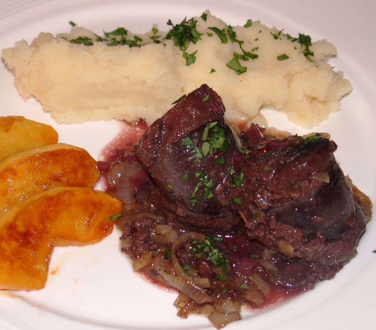 5) Servir le boudin sur quelques échalotes et oignons et napper de sauce. Disposer quelques quartiers de pommes caramélisées et servir avec une bonne purée de patates.