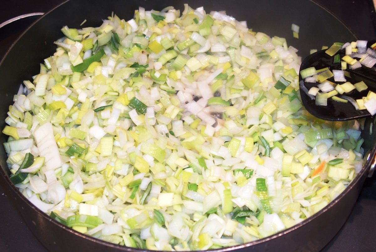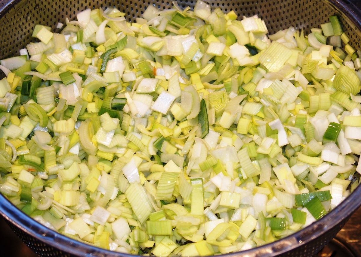 2) Pendant ce temps, préparer le reste de la garniture. Enlever pratiquement l'entier des feuilles vertes des poireaux. Couper les poireaux en deux dans la longueur, puis émincer finement. Mettre les poireaux dans une passoire et bien les rincer à l'eau froide. Laisser égoutter. Hacher l'oignon finement et réserver.