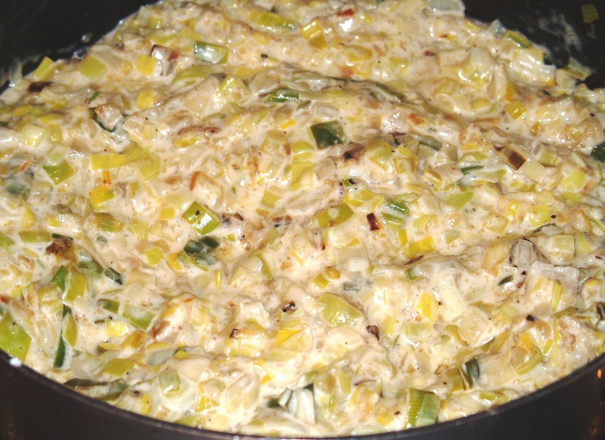 4) Dans la même poêle, faire fondre 1 càs de beurre. Faire revenir les poireaux et l'oignon haché 5 à 10 minutes sur feu moyen en mélangeant souvent. Ajouter le vin blanc et faire complètement réduire. Lorsqu'il n'y a plus de liquide, ajouter la farine et bien mélanger (on ne doit plus la voir). Prélever 1,5 dl du bouillon de la casserole du poulet et ajouter. Ajouter la crème. Saler et poivrer. Cuire 2 minutes. Goûter et rectifier l'assaisonnement. Retirer de la plaque et laisser tiédir.