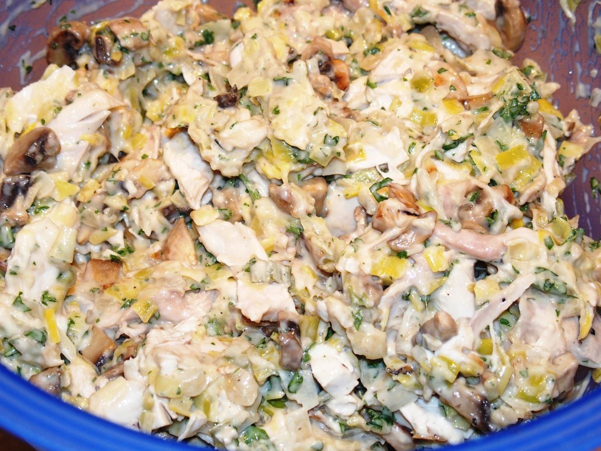 6) Hacher le persil et mettre avec le poulet. Ajouter aussi les poireaux et les champignons. Bien bien mélanger le tout. Goûter et éventuellement, rectifier l'assaisonnement en sel si besoin. Préchauffer le four à 180°C.