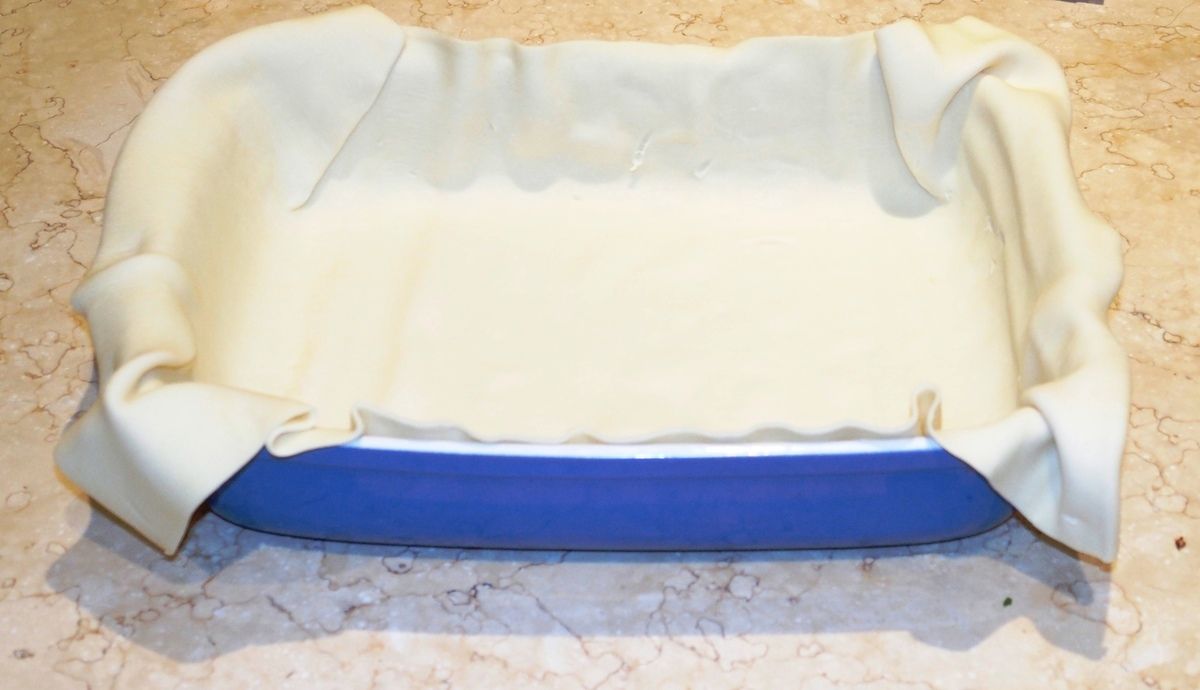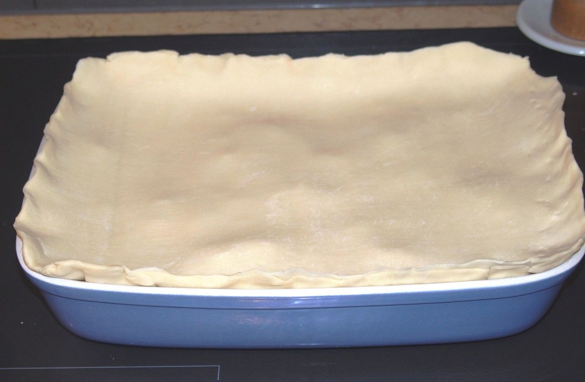 7) Beurrer un plat à gratin (j'ai utilisé un plat de 31 sur 22 cm et 6 cm de haut). Déposer la première abaisse de pâte dans le plat en appuyant sur le fond et le contour, tout en la faisant remonter sur les bords. Mettre la garniture.