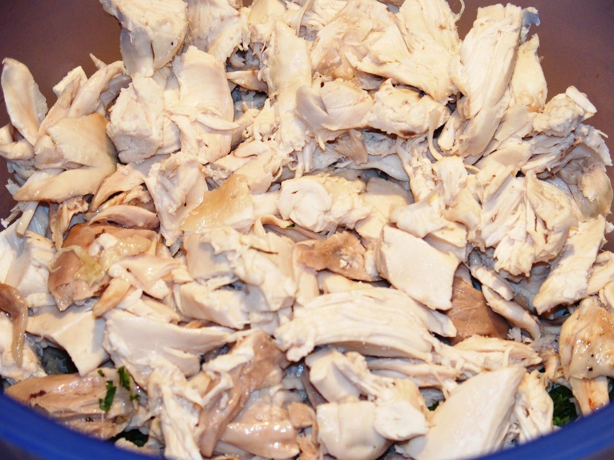 5) Sortir le poulet de la casserole et le laisser tiédir. Garder le bouillon pour un autre usage, comme pour une soupe. Le découper (voir vidéo en bas de l'article). Enlever la peau et effilocher la chair ou la couper en petits morceaux. Mettre dans un grand récipient.
