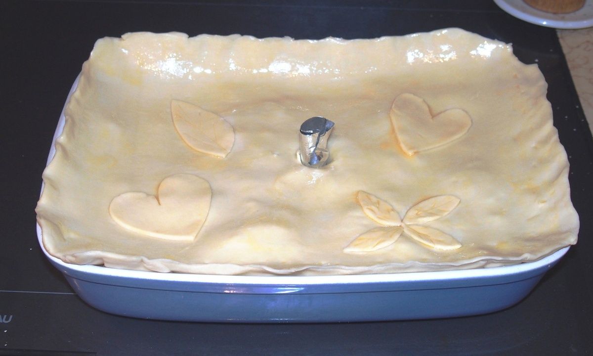 8) Déposer ensuite délicatement la deuxième abaisse par-dessus. Avec un couteau, suivre les contours du plat et enlever l'excédent. Puis, avec les doigts, presser les deux pâtes ensemble sur tout le tour pour les souder. Avec le reste de pâte, faire quelques petites décos si vous le souhaitez. Au milieu, faire un petit trou avec un couteau. Pour faire la cheminée, rouler un petit bout de papier aluminium autour de votre petit doigt, retirer et le placer dans le trou. Dorer la pâte avec l'oeuf.