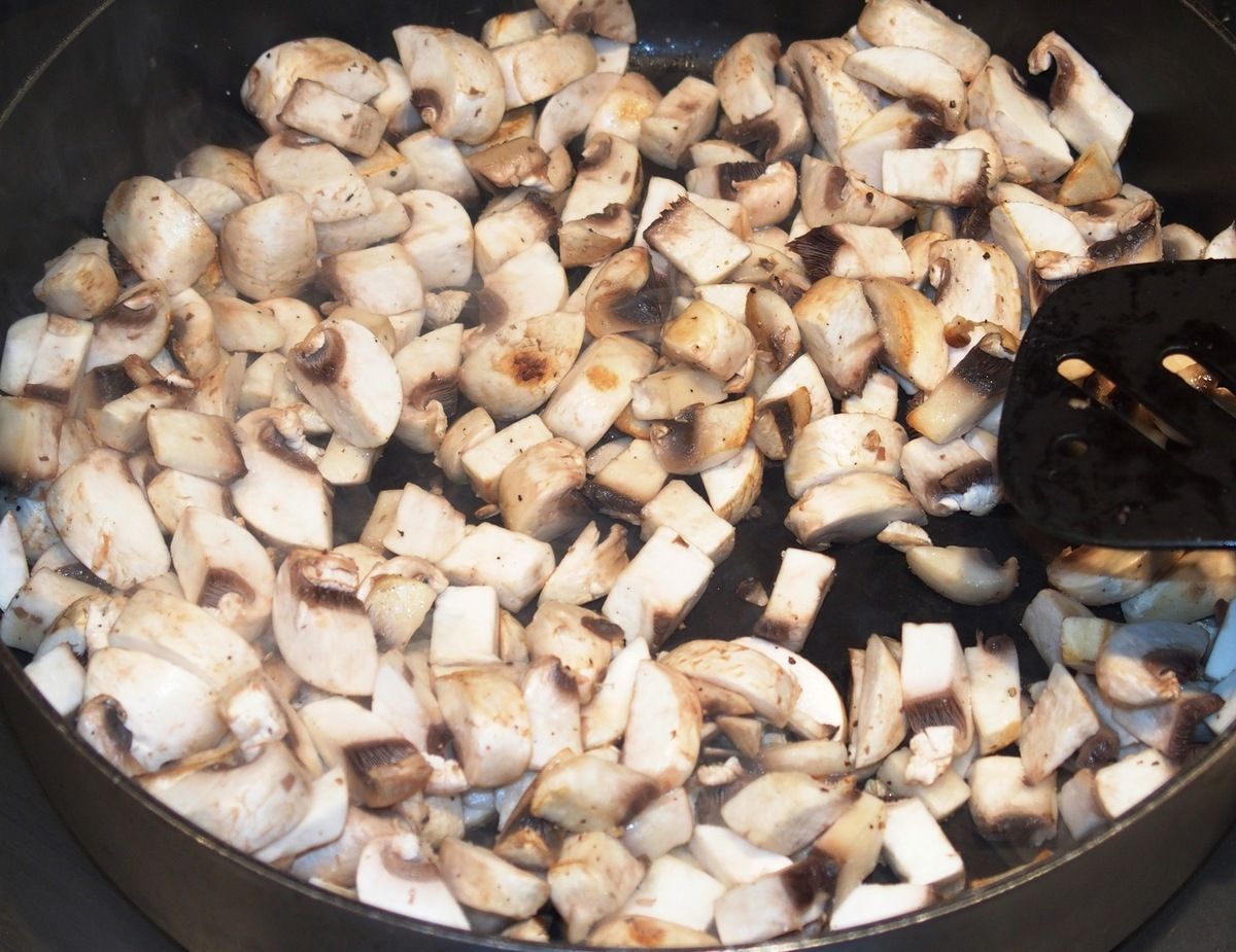 3) Enlever le pied des champignons. Les essuyer avec du papier ménage s'il y a de la terre. Les couper en petits morceaux. Dans une grande poêle, faire fondre 1 càc de beurre et ajouter les champignons. Saler, poivrer. Les faire revenir sur feu moyen-vif 5 à 10 minutes jusqu'à ce qu'ils aient rendu toute leur eau. Mettre de côté dans un récipient.