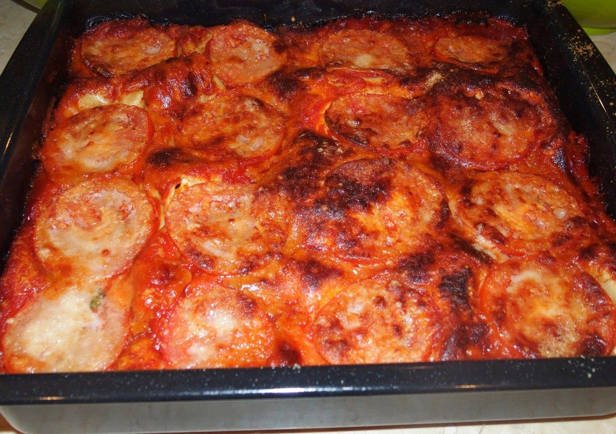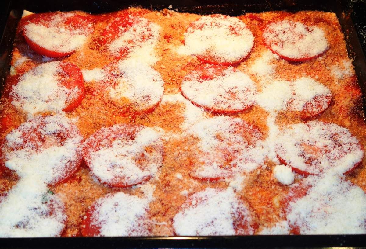 • Mettre le dernier 1/4 de la sauce tomate, les tranches de tomates et saupoudrer de parmesan frais râpé.