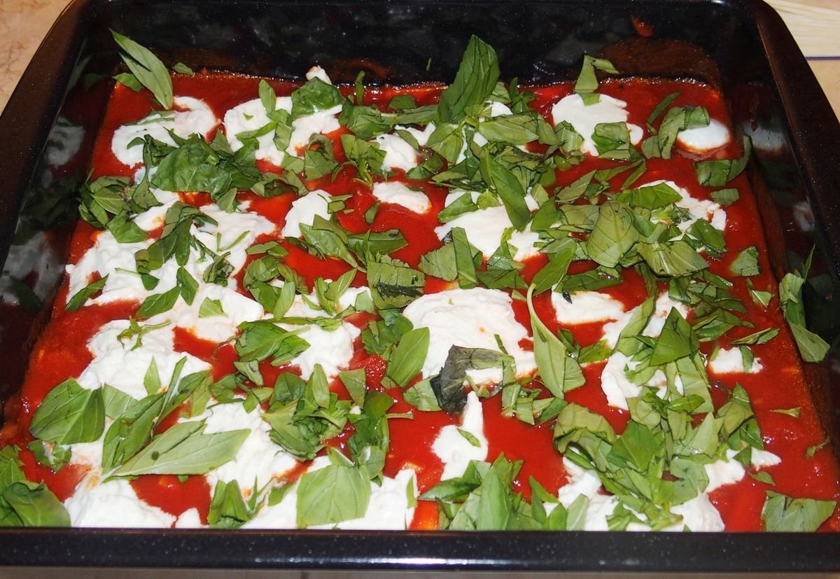 6) Préchauffer le four à 200°C. Ciseler grossièrement le basilic. Couper les boules de mozzarella en tranches fines. Couper les tomates en tranches. Monter les lasagnes dans un grand plat à gratin: