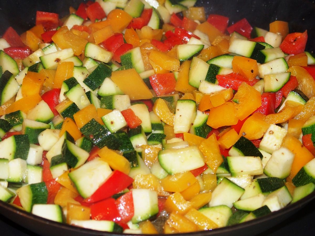 5) Dans une poêle haute, faire revenir les poivrons et les courgettes dans un filet d'huile d'olive et laisser cuire 5 minutes sur feu moyen en mélangeant. Il faut qu'ils restent un peu croquants. Saler. Réserver et laisser refroidir.