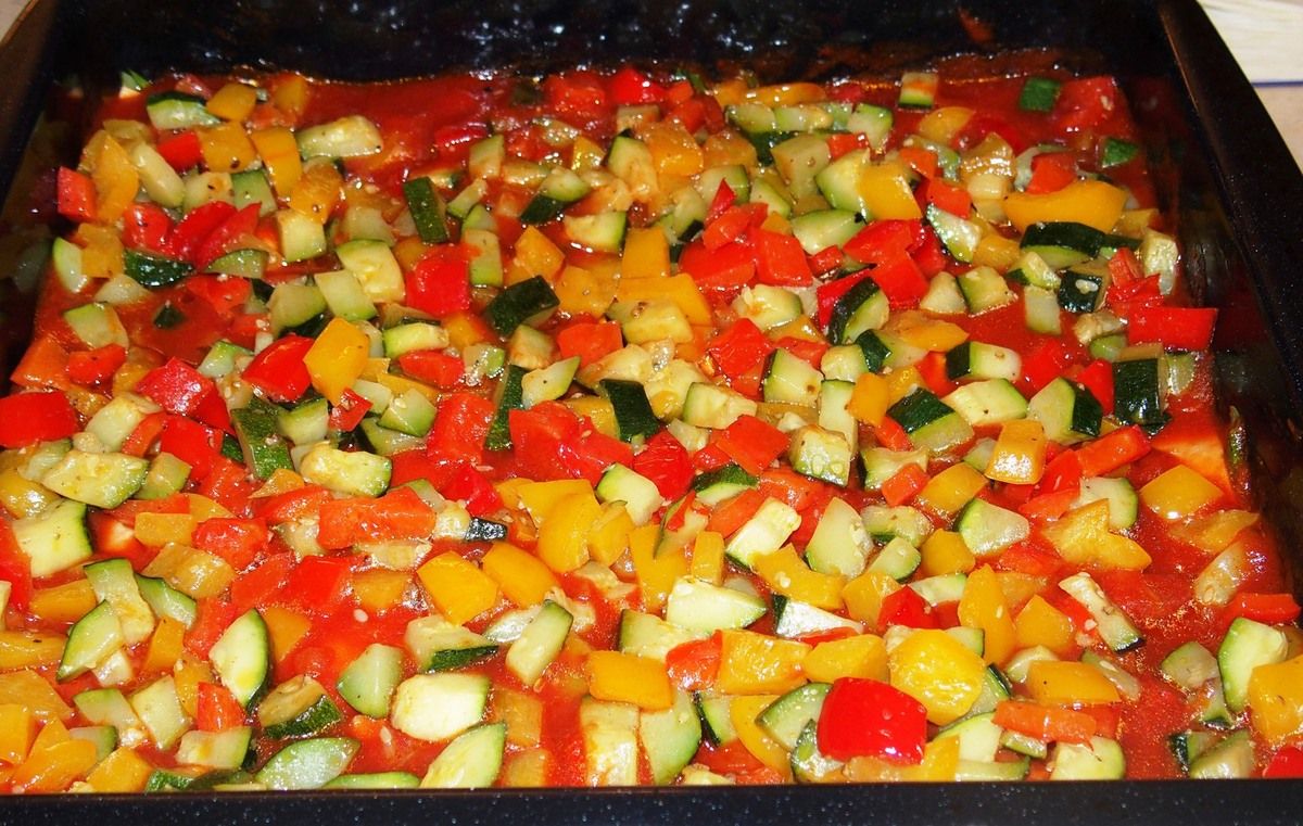 • Mettre 1/4 de la sauce tomate, puis les poivrons et les courgettes
