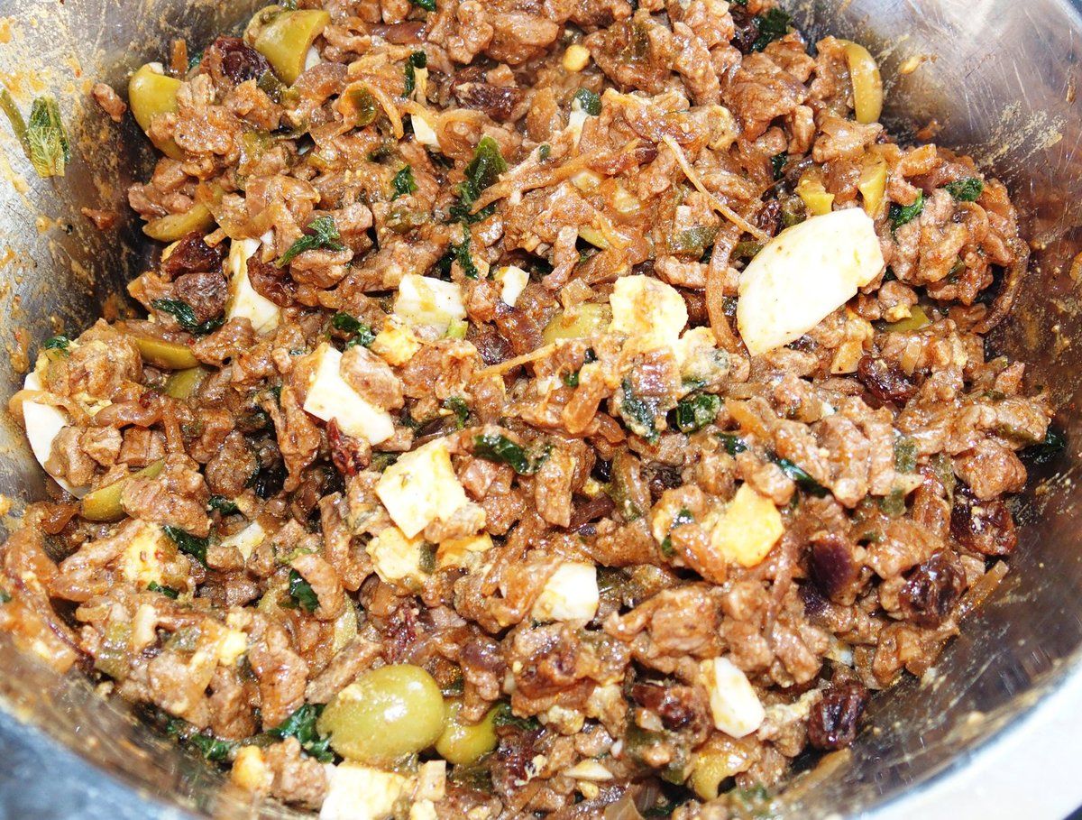 7) Dans une poêle, faire revenir les oignons et l'ail dans un filet d'huile d'olive sur feu moyen-vif. Ajouter la viande et faire revenir 2 minutes. Saler, poivrer. Ajouter une bonne pincée de cumin et de paprika (plus ou moins selon vos goûts). Diluer le concentré de tomate dans 1 dl d'eau et ajouter. Faire complètement réduire. Ajouter la menthe et la coriandre. Laisser tiédir dans un récipient puis mélanger avec les oeufs, les olives et les raisins égouttés. Votre farce est prête!