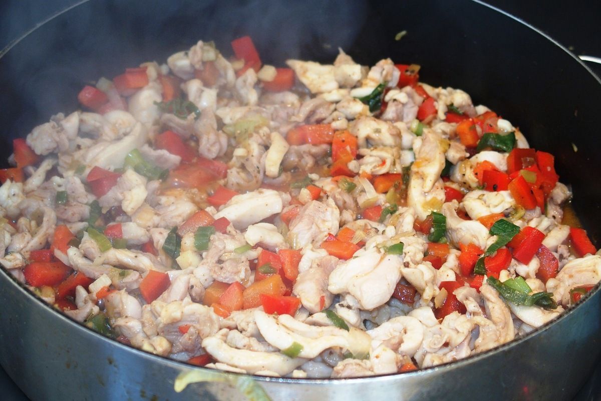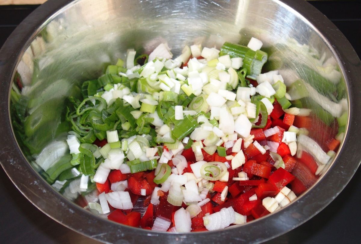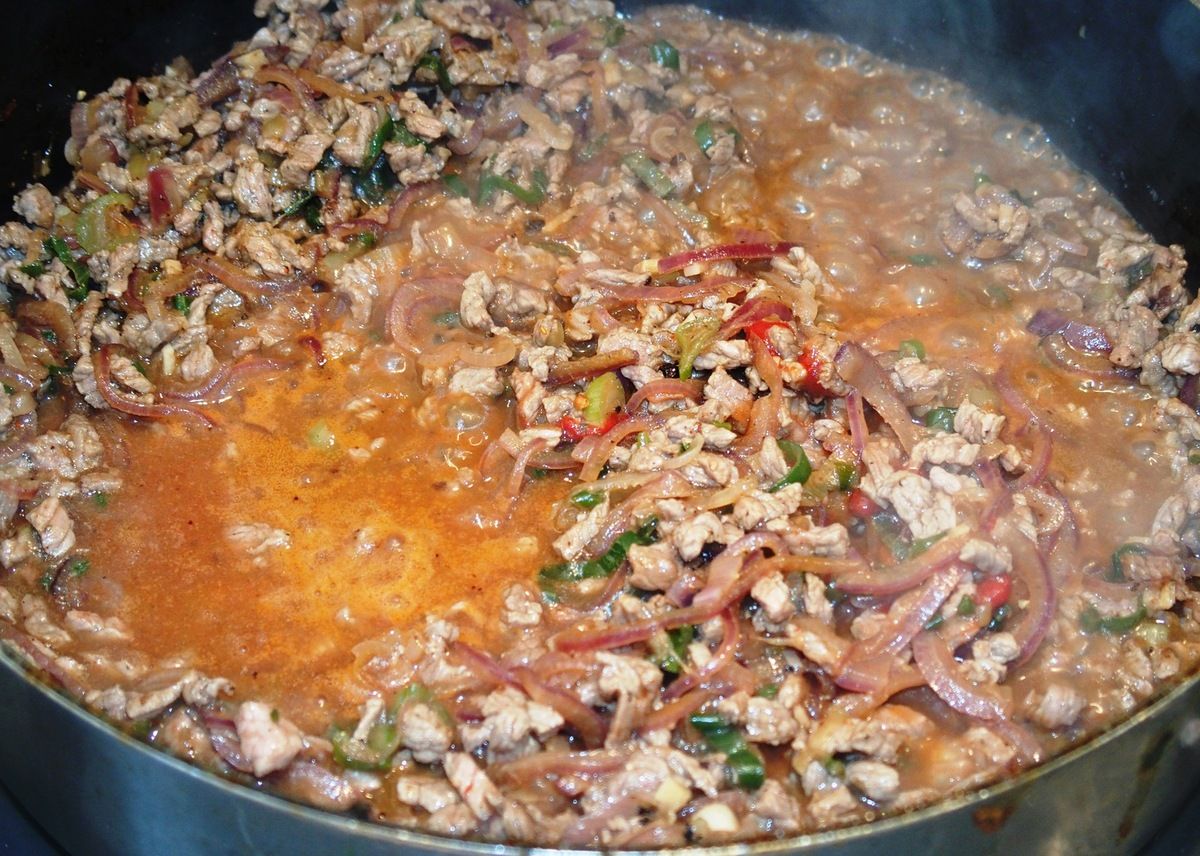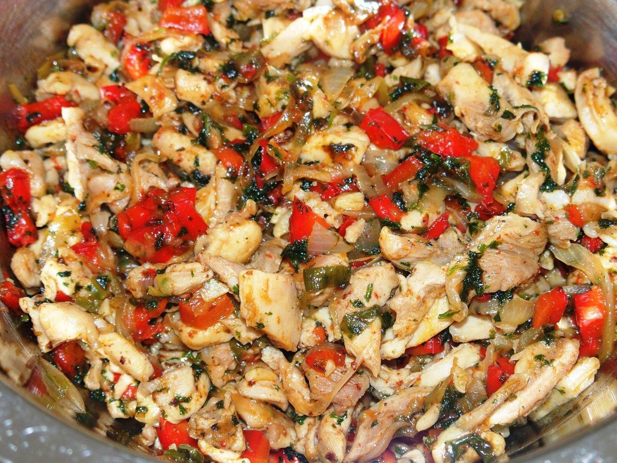3) Dans une poêle, faire revenir le mélange de légumes dans un filet d'huile d'olive sur feu moyen vif 5 minutes. Ajouter les lanières de poulet. Ajouter une bonne pincée d'origan ainsi qu'une bonne pincée de poudre de chili ou de paprika fort (plus ou moins selon vos goûts). Saler et poivrer. Laisser cuire 10 minutes à feu moyen. Pendant ce temps, hacher le persil. Après 10 minutes, ajouter 1 dl d'eau et faire réduire complètement. Ajouter le persil. Goûter, rectifier l'assaisonnement et laisser tiédir hors du feu dans un récipient.