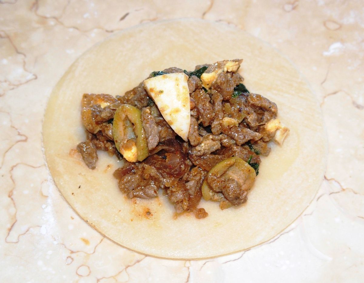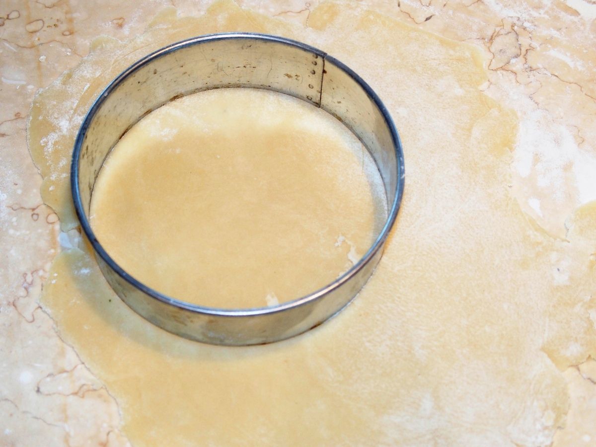 8) Préchauffer le four à 200°C. Etaler la pâte maison (la sortir du réfrigérateur 10 minutes avant) à l'aide d'un rouleau à pâtisserie sur un plan de travail fariné. Ou disposer devant vous une première abaisse de pâte. Prendre un emporte-pièce d'un diamètre d'environ 10cm. Découper des ronds de pâte. Ne pas hésiter à étaler les chutes de pâte! Prendre un pinceau et le tremper dans de l'eau froide. Humidifier ainsi tout le pourtour du rond puis placer une càs de farce au centre.
