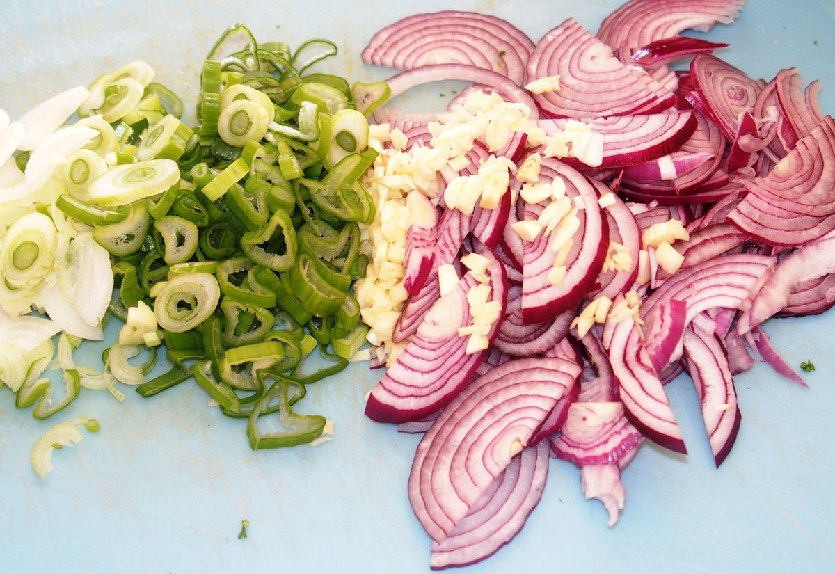 5) Farce au boeuf: 30 minutes avant, réhydrater les raisins secs dans un bol d'eau tiède. Cuire les oeufs 10 minutes dans de l'eau frémissante pour obtenir des oeufs durs. Ecaler et les couper en dés. Réserver. Ciseler les oignons rouges ainsi que l'oignon de printemps avec le 3/4 des tiges et les gousses d'ail. Réserver.