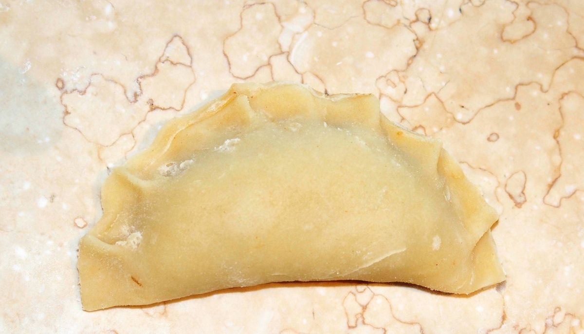 9) Rabattre la moitié du rond sur la deuxième. Avec les doigts, bien retravailler tout le bord pour sceller les deux pâtes. Puis pincer la pâte régulièrement pour donner une petite décoration.