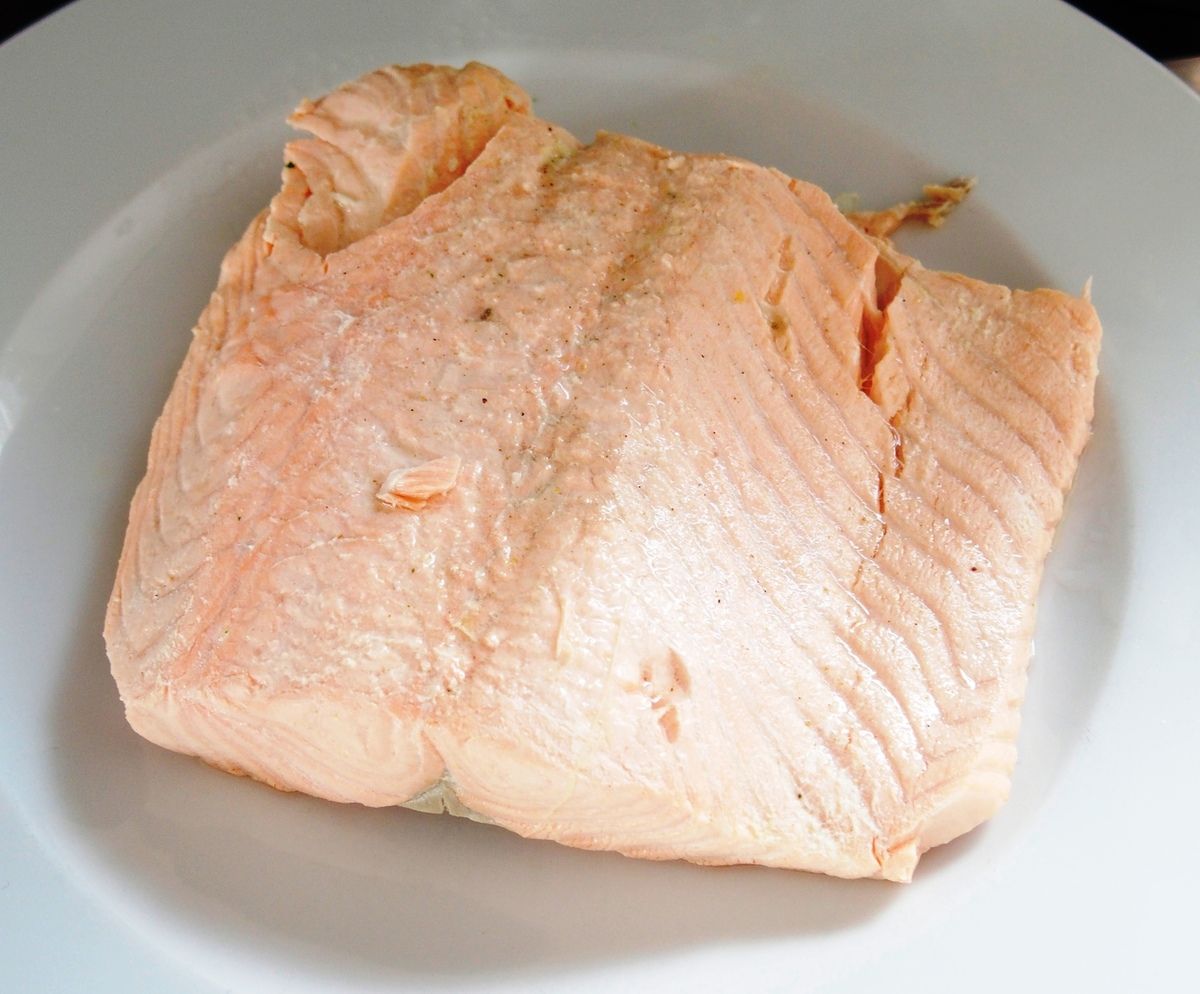 2) Dans une autre casserole, mettre à bouillir de l'eau (en quantité nécessaire pour que le morceau de saumon soit poché) avec un cube de bouillon de légumes. A l'ébullition, baisser à frémissements et plonger le saumon pendant 5 à 6 minutes. Egoutter et laisser tiédir.
