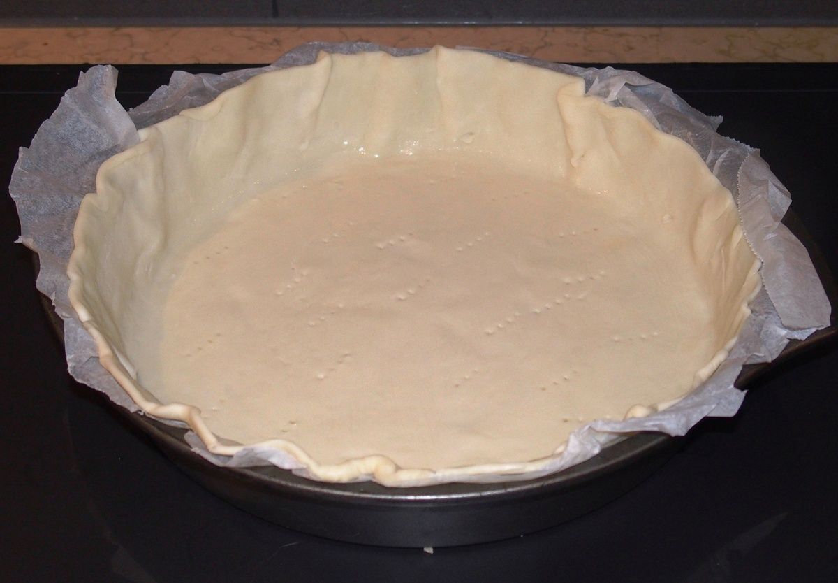 3) Foncer le moule à tarte avec la pâte abaissée. Moi, je laisse le papier sulfurisé. Sinon, beurrer et fariner le moule à tarte avant d'y déposer la pâte. Bien appuyer sur la pâte sur tout le tour du moule afin qu'elle adhère bien. La coller presque contre les bords (sinon elle va se rétracter et retomber dans le moule). Ainsi que sur le contour du fond qui fait angle droit avec les bords. Piquer avec une fourchette le fond. Dans un grand récipient, casser les oeufs. Tremper un pinceau à pâtisserie uniquement dans le blanc et badigeonner le fond de la tarte au pinceau avec le blanc (l'équivalent d'une cuillère à soupe). Enfourner dans le bas du four préchauffé à 220°C sur la grille pour 7 minutes. Si la pâte lève en cours de cuisson, ouvrez la porte du four et piquez avec une fourchette. Non mais, on va pas se laisser faire... Sortir la plaque du four et réserver. Baisser la température à 200°C.