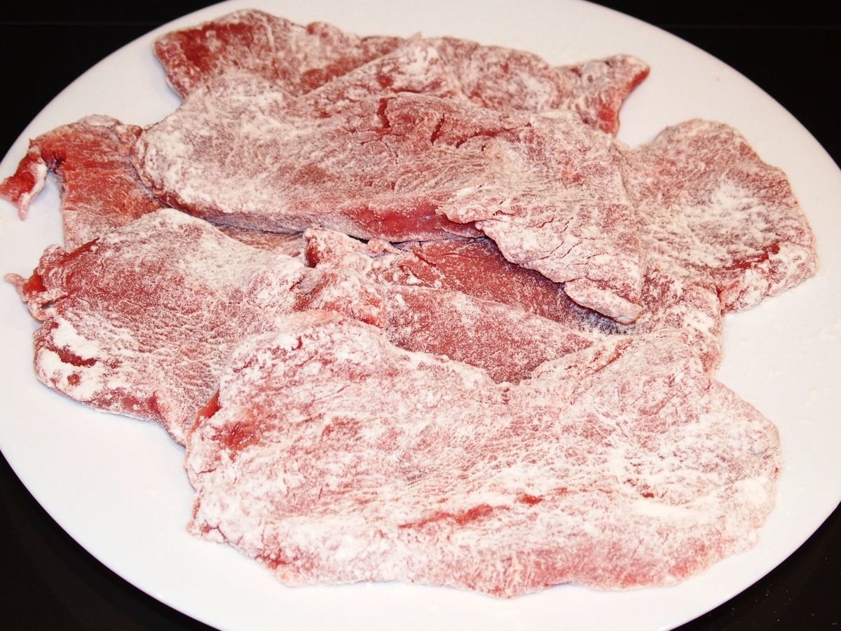 1) Sur une planche, disposer les escalopes. Les essuyer avec du papier ménage. Avec un fond de verre par exemple, les aplatir légèrement. Fariner les escalopes et enlever l'excédent. Mettre dans un plat.