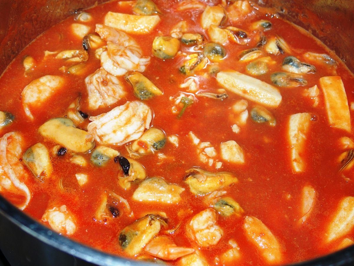 4) Mettre le jus des moules dans la casserole du fond de poisson après 1 heure de cuisson. Passer le tout à travers un chinois ou une passoire fine. Remettre 6 dl dans la casserole. Ajouter le coulis de tomate et porter à ébullition. Baisser le feu et laisser mijoter 10 minutes. Ajouter tout d'abord les anneaux de calamars (coupés en morceaux ou non). Après 5 minutes, ajouter les vongoles, les crevettes et les morceaux de poisson. 5 minutes plus tard, lorsque les vongoles sont ouvertes, les crevettes roses et les morceaux de poisson cuits, ajouter les moules décortiquées et cuire encore 1 minute. Goûter et rectifier l'assaisonnement. Mélanger immédiatement la sauce avec des pâtes al dente et parsemer d'un peu de persil. Servir.