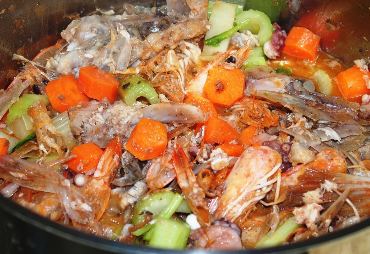 2) Préparer le fond de poisson: dans une casserole, faire revenir dans un filet d'huile d'olive les carapaces des crevettes ainsi que les queues et têtes de poisson. Bien les marquer à feu vif, même si le fond attache un peu, pendant 5 minutes en mélangeant. Ajouter tous les légumes du point 1. Faire revenir sur feu moyen-vif en grattant le fond avec la spatule 5 minutes. Ajouter le vin blanc et bien détacher encore le fond avec la spatule. Ajouter les grains de poivre, le bouquet de persil en entier, 1 grosse pincée de sel et 1 litre d'eau. Porter à ébullition, mélanger. Baisser le feu sur feu moyen et laisser réduire à découvert pendant 1 heure.