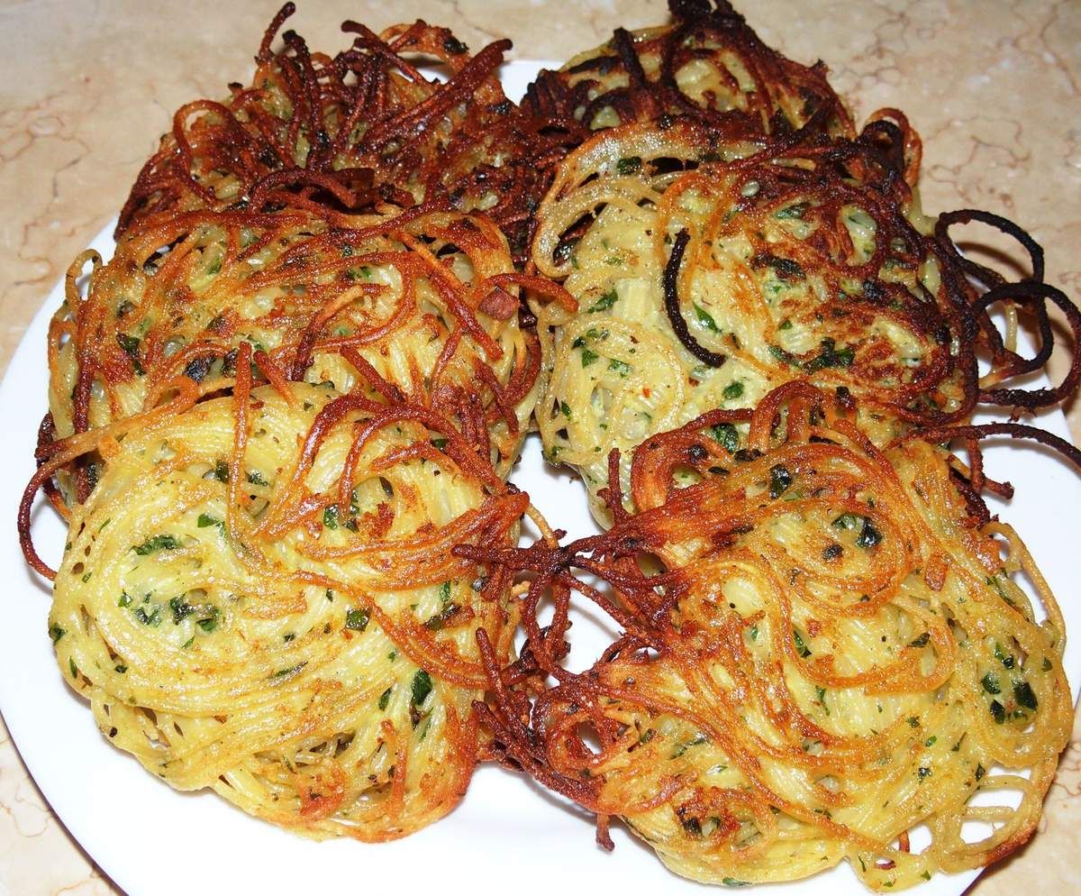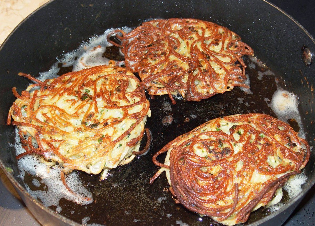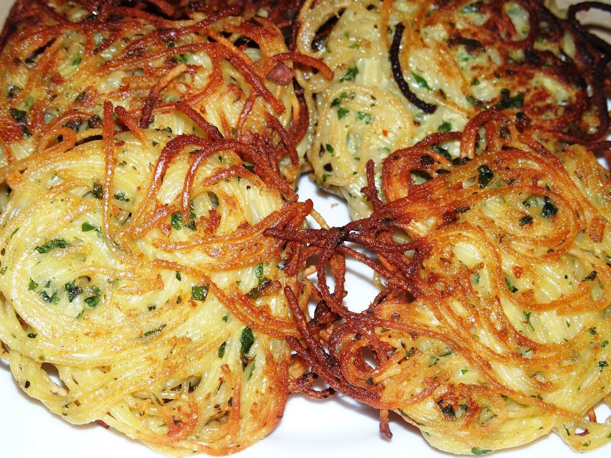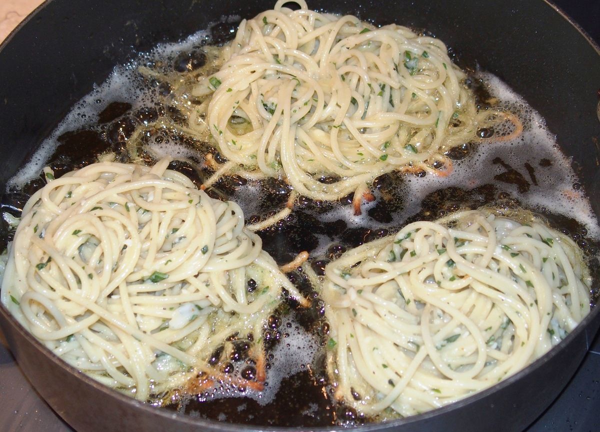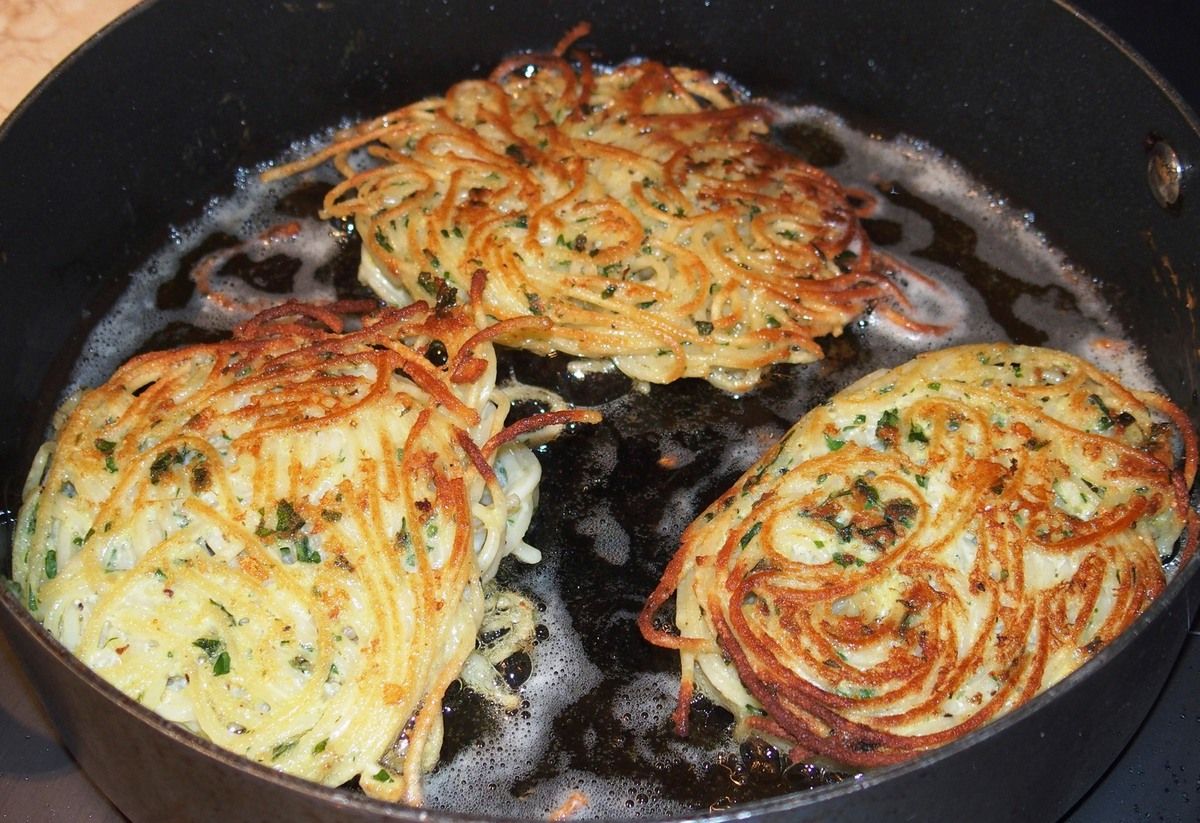 4) Mettre à chauffer de l'huile d'olive sur tout le fond d'une poêle. Avec une fourchette, déposer des petits nids de spaghettis dans la poêle. Les aplatir un peu, ils ne doivent pas être trop épais. Sur feu moyen, les faire dorer 2 à 3 minutes sur une face puis les retourner et les laisser cuire encore 2 à 3 minutes. Les égoutter sur du papier ménage. Répéter l'opération. Tenir au chaud les beignets au four à 70°C dans un plat.