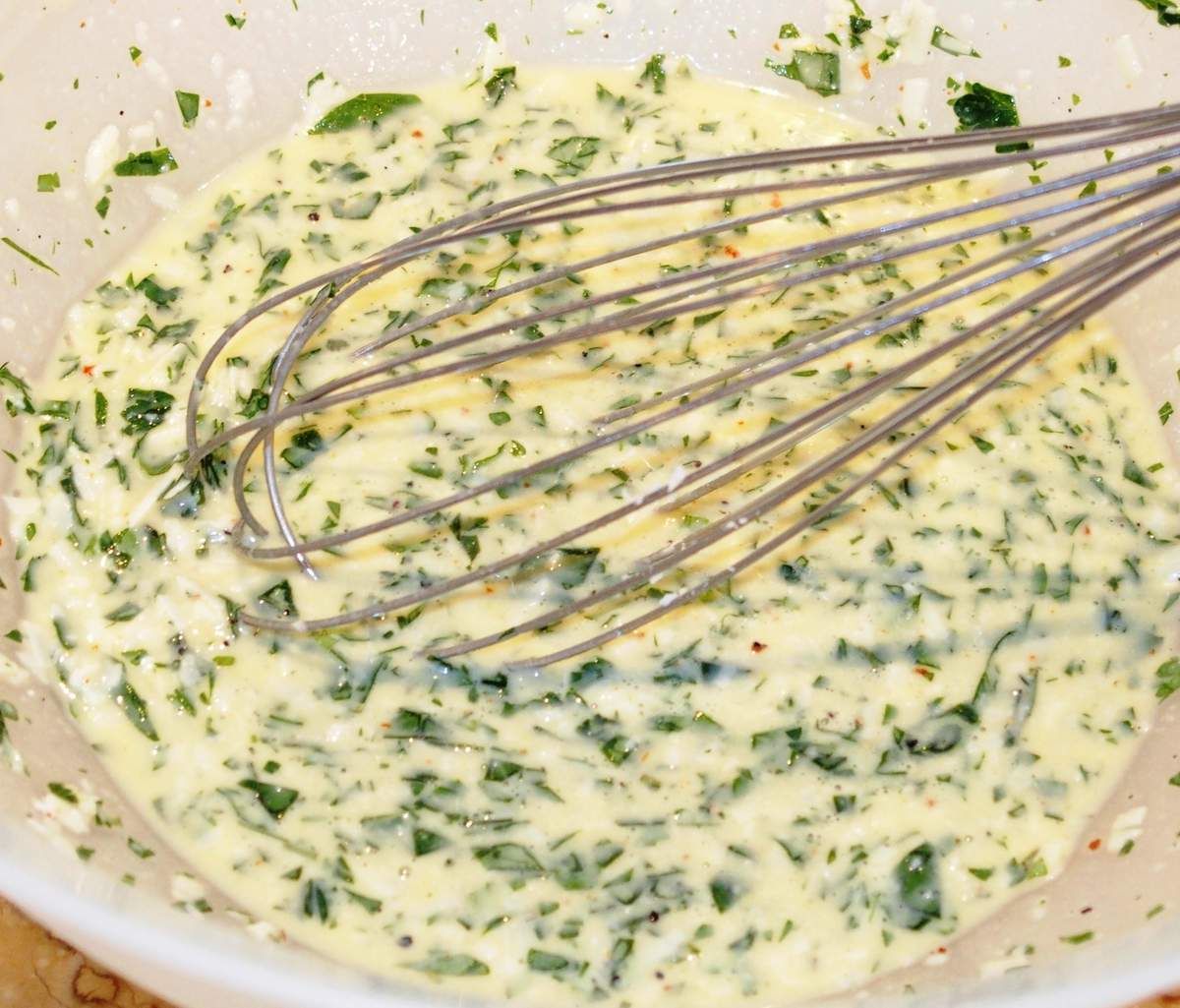 2) Dans un saladier, casser les oeufs. Ajouter le lait et la farine et bien mélanger au fouet. Ciseler les herbes et ajouter. Râper le parmesan et ajouter. Hacher les gousses d'ail et ajouter également. Saler, poivrer et ajouter une bonne pincée de piment séché.