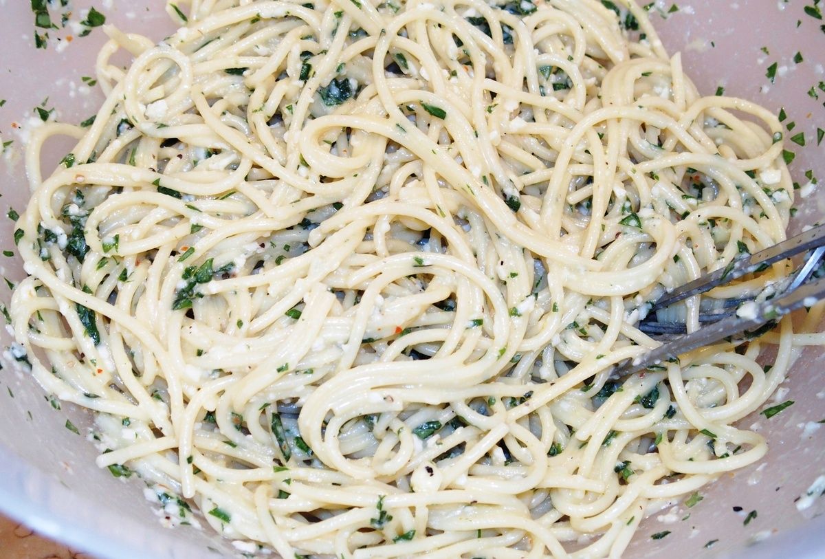 3) Ajouter les spaghettis et mélanger soigneusement le tout.
