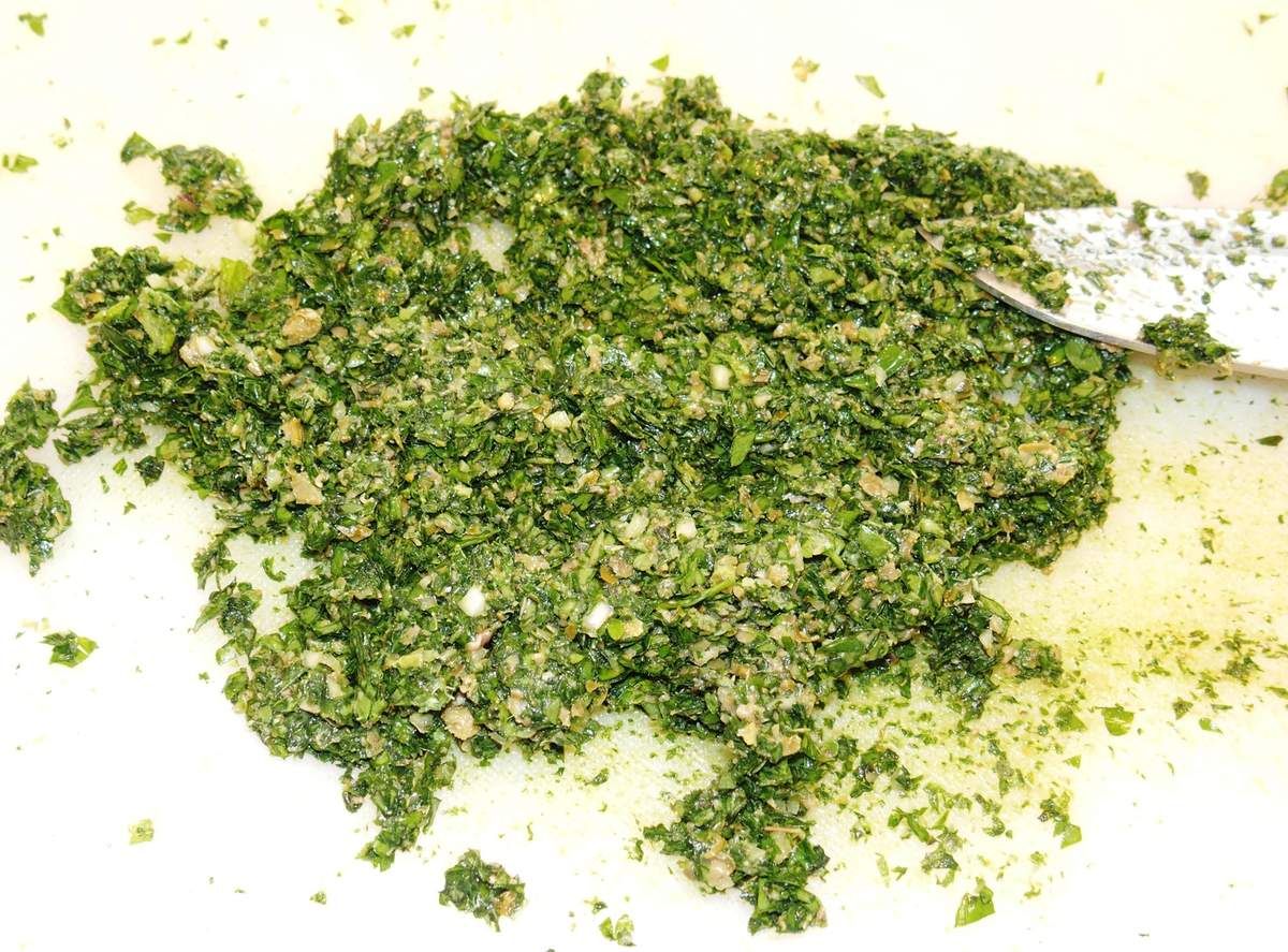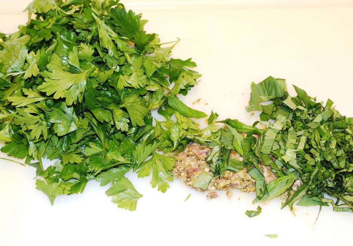 2) Effeuiller toutes les herbes et les mettre sur la planche par dessus le mélange précédent. Les hacher finement, tout en les mélangeant avec les anchois, ail et câpres.