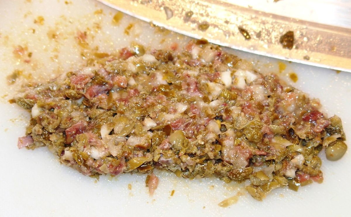 1) Ecraser la gousse d'ail pelée sur une planche avec le plat d'un couteau. Ajouter les câpres et les filets d'anchois sur la planche avec la gousse d'ail et hacher très finement le tout.