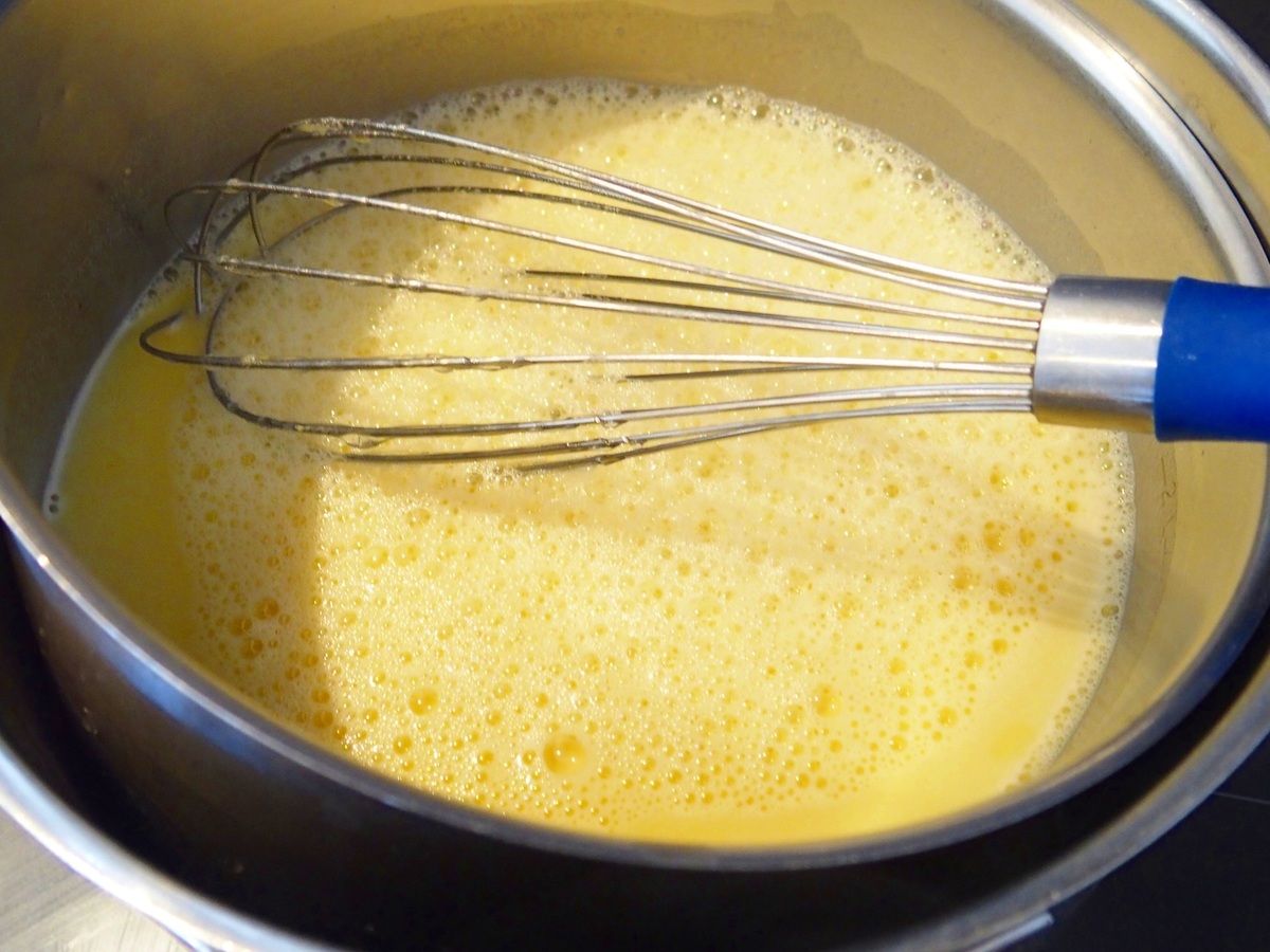 4) Verser le sirop en filet dans le mélange aux oeufs tout doucement en fouettant énergiquement. Verser la préparation dans une casserole. Mettre cette casserole dans une autre casserole plus grande avec un peu d'eau à hauteur de la petite. Nous allons cuire la crème au bain-marie 10 minutes sur feu moyen à frémissements, toujours en mélangeant régulièrement.