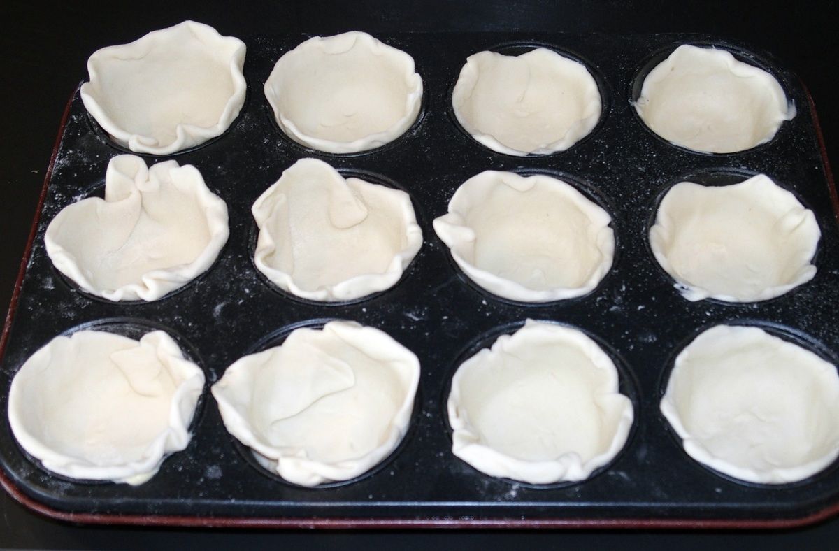 1) Retirer le papier de la pâte feuilletée et former un rouleau dans la longueur. Découper des tronçons d'environ 2 cm. Beurrer les petits moules. Prendre chaque tronçon dans la main et l'aplatir en cercle. Vous pouvez vous aider d'un rouleau à pâtisserie. Mettre les disques de pâte dans les moules et les faire remonter un peu. Mettre au réfrigérateur.