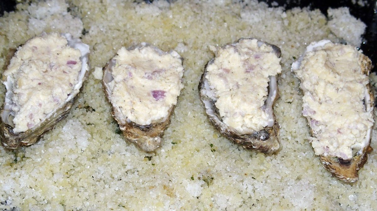 2) Recouvrir le fond d'un plat à gratin avec du gros sel, ce qui maintiendra les huîtres bien en place. Ouvrir les huîtres à l'aide d'un ouvre-huître. Jeter la première eau. Faire attention à ce qu'il n'y ait pas de bout de coquille dans l'huître. Farcir les huîtres à l'aide d'une petite cuillère avec la préparation. Disposer les huîtres dans le plat.