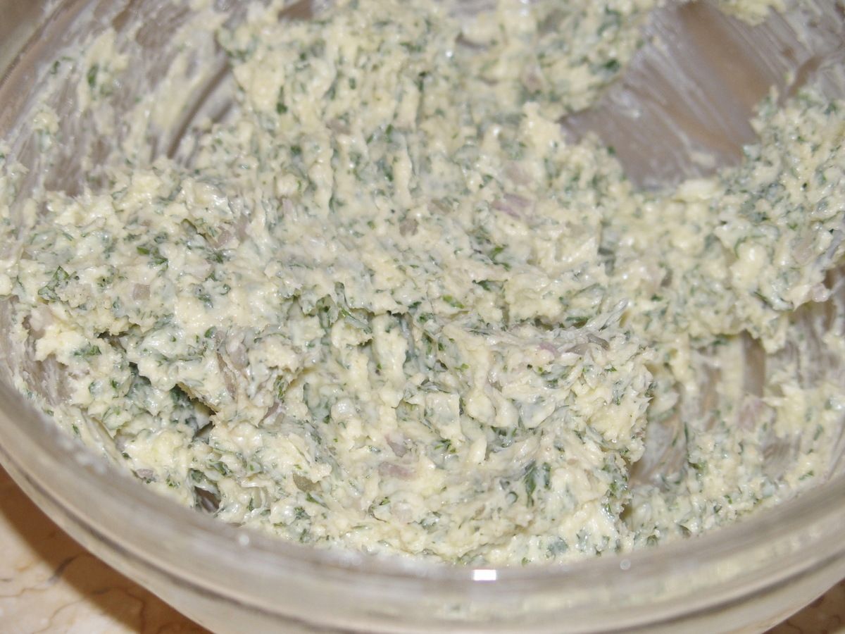 3) Pendant ce temps, préparer la farce: hacher finement l'échalote et l'ail ainsi que le persil . Travailler le beurre en pommade puis ajouter l'ail, l'échalote et le persil. Saler, poivrer et ajouter la chapelure. Bien mélanger.