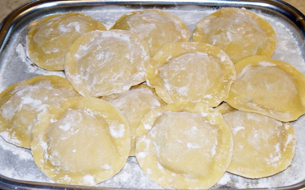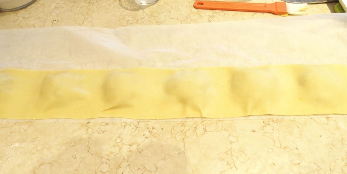 4) Dérouler une feuille de pâte à nouilles. Déposer à distance régulière 6 càs de farce sur le bas de la feuille. Badigeonner d’eau toute la feuille avec un pinceau (entre les ravioles aussi). Rabattre le haut de la pâte à nouilles sur le bas. Avec les doigts, presser la pâte autour des ravioles. Découper les ravioles à l’emporte-pièce, rond ou carré. Travailler chaque raviole avec les doigts un peu mouillés sur tout le tour pour bien souder la pâte. Fariner légèrement chaque raviole. Déposer sur un plat et réserver au frais si vous les préparez à l'avance.