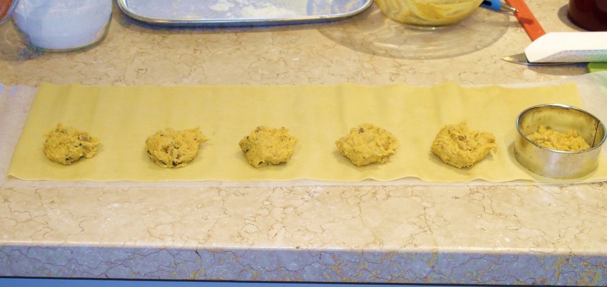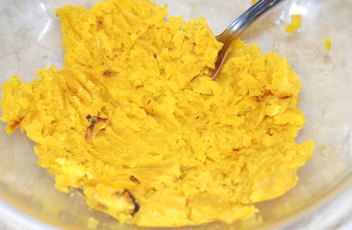 3) Dans un récipient, mettre les tranches de courge (peser pour obtenir environ 180g) et avec une fourchette, réduire en purée. Ajouter la ricotta, les dés de lard, l’œuf et mélanger. Saler légèrement, poivrer et saupoudrer de noix de muscade. Bien mélanger.