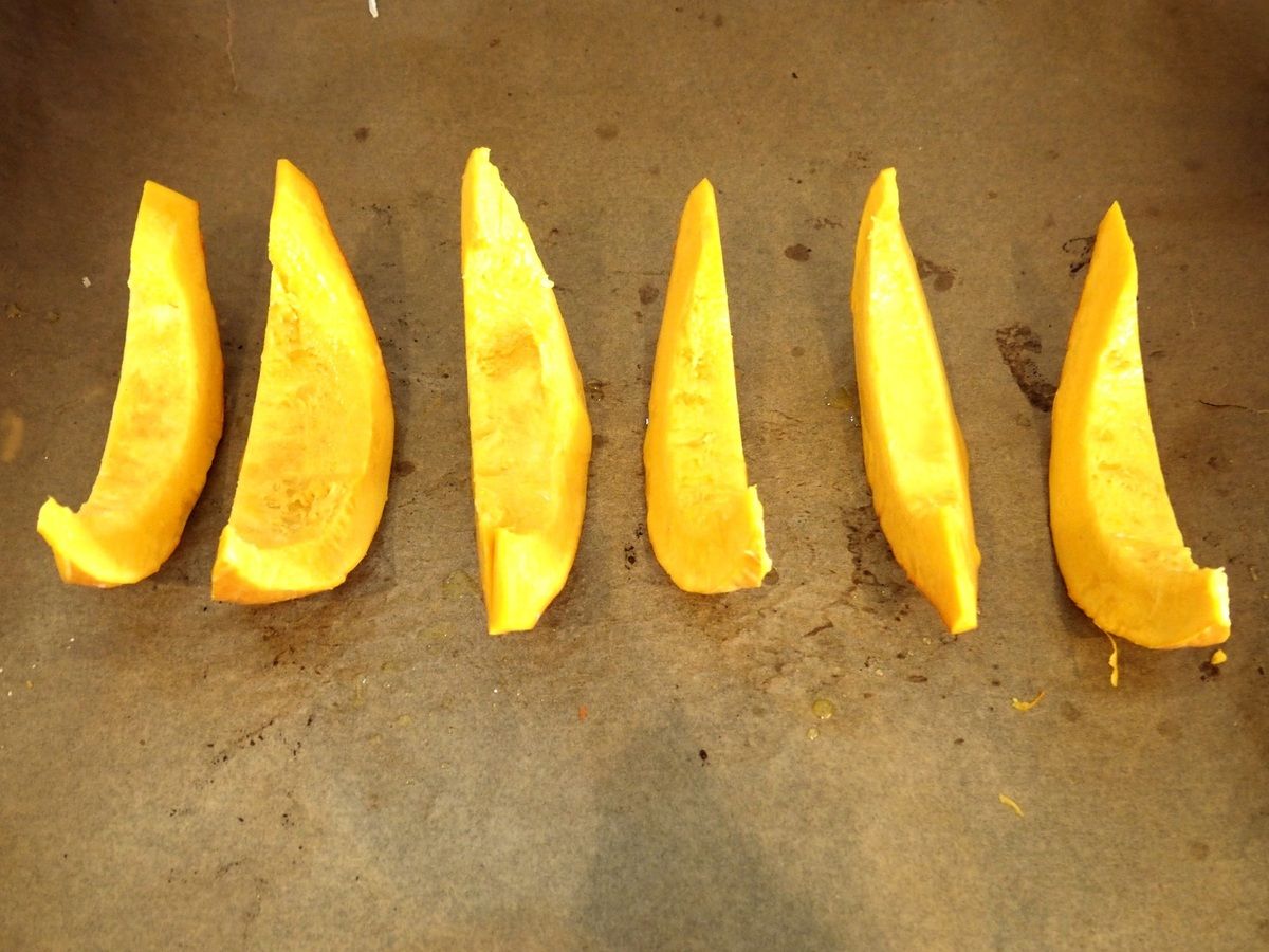1) Préchauffer le four à 220°C. Peler la courge et couper les extrémités. Couper en deux et retirer les pépins. Couper en tranches d'environ 1cm d'épaisseur et badigeonner avec un peu d’huile d’olive. Disposer sur une plaque recouverte de papier sulfurisé. Enfourner pour environ 20 minutes jusqu’à ce que la chair soit tendre. Sortir et laisser tiédir.
