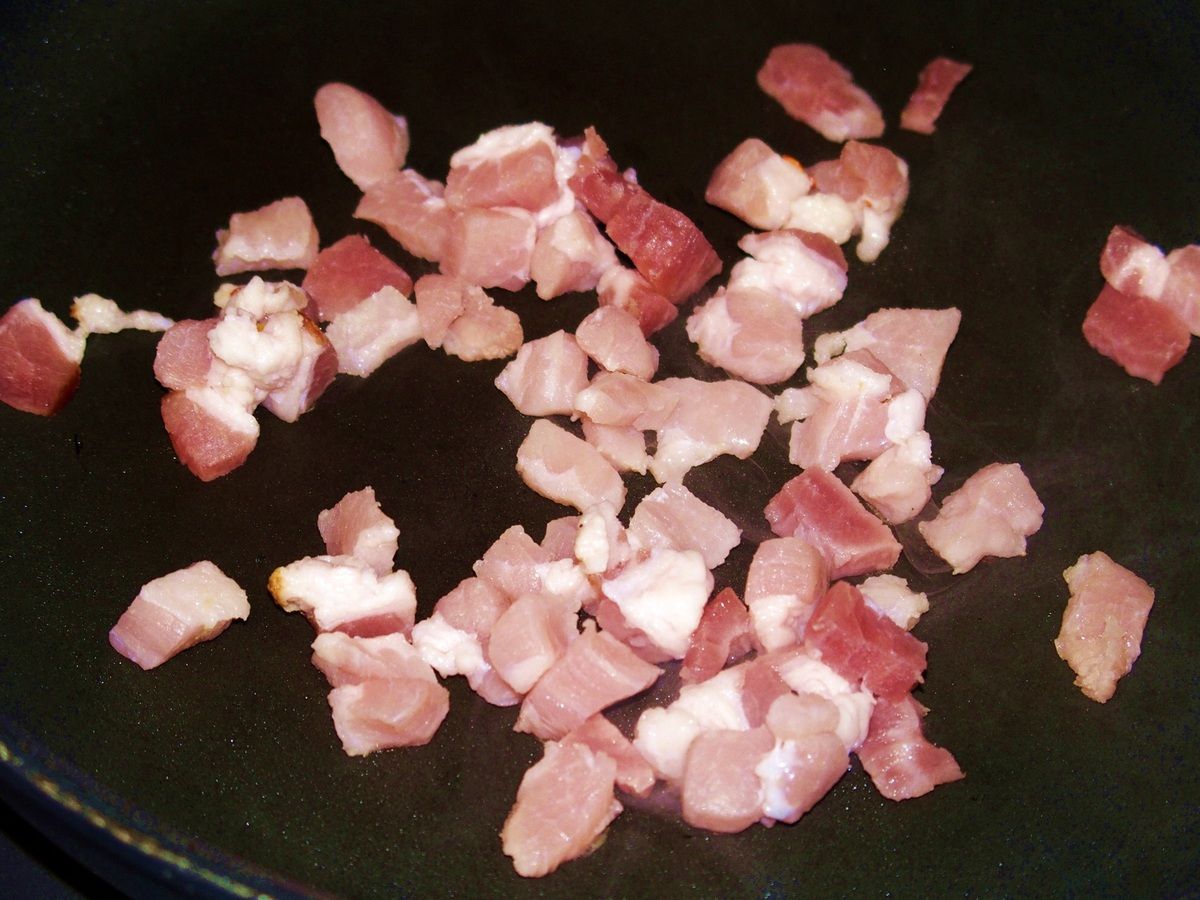 2) Pendant ce temps, ôter la couenne du lard fumé. Couper le lard en tout petits dés et faire revenir dans une poêle sans matière grasse en mélangeant sur feu moyen-vif 5 minutes. Déposer les dés de lard sur du papier ménage et réserver.