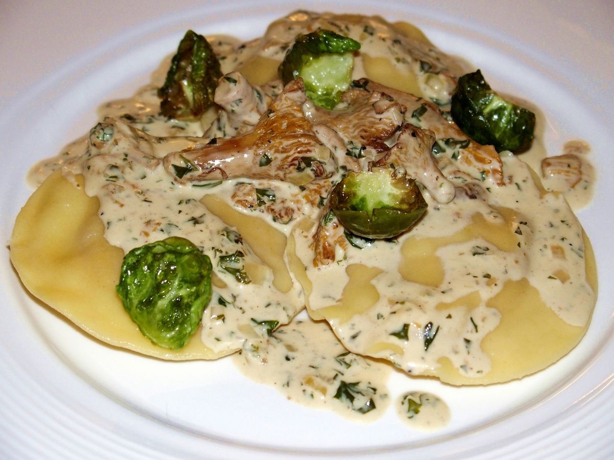 6) Cuire les ravioles 4 à 5 minutes dans de l’eau frémissante, égoutter avec une écumoire et servir de suite dans les assiettes, nappées de sauce, aux chanterelles, par exemple. Décorer avec quelques feuilles de choux de Bruxelles frites, ou un peu de persil.