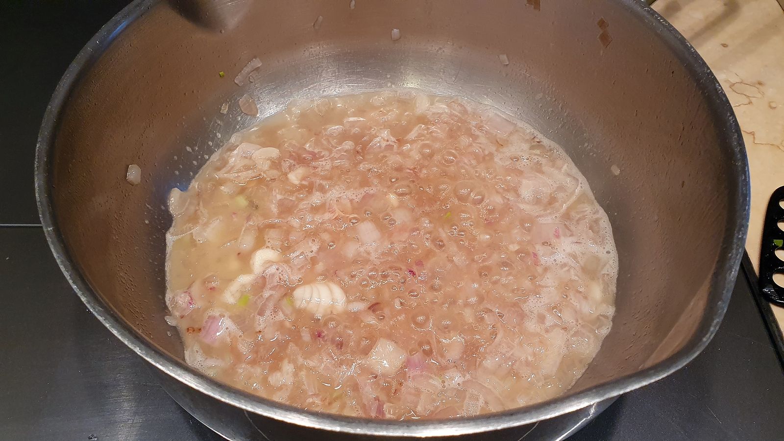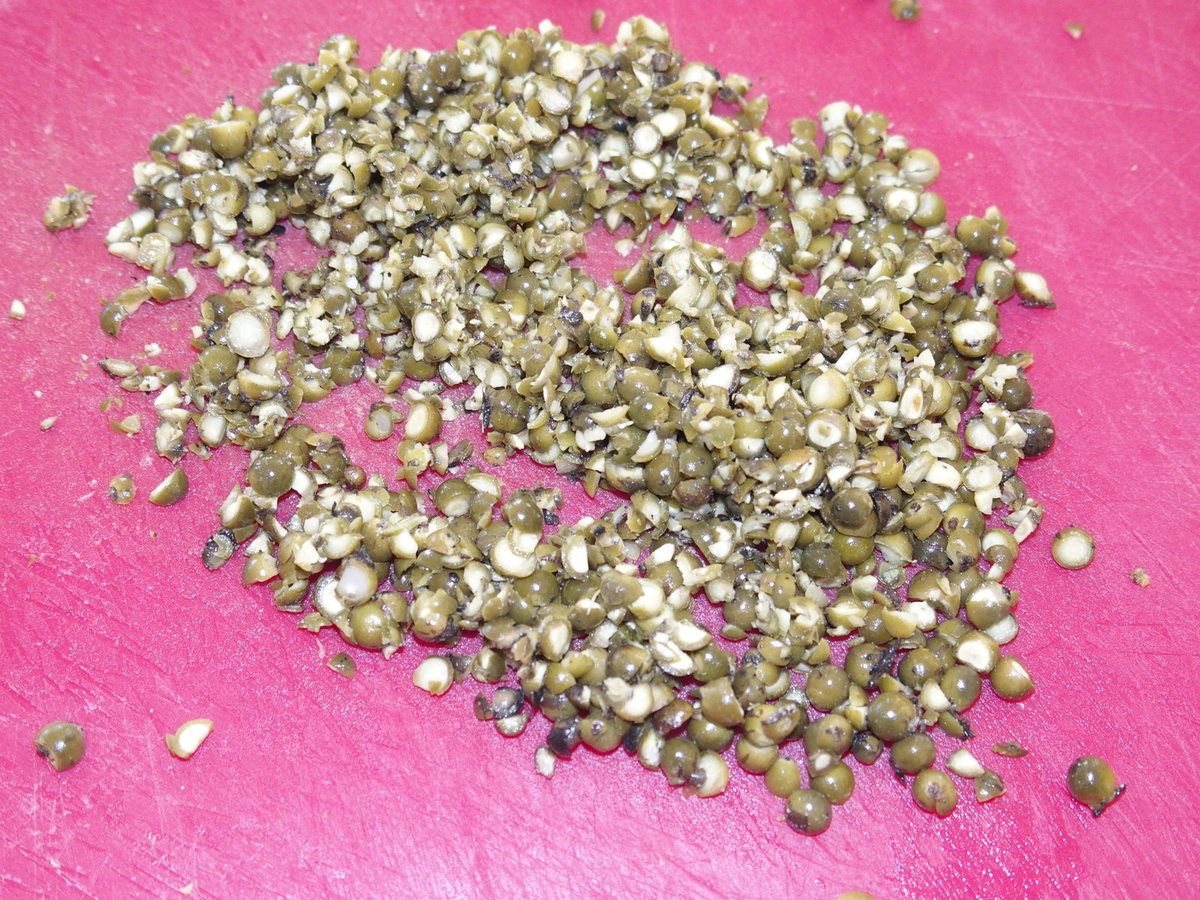 1) Hacher les échalotes et la gousse d’ail. Egoutter les grains de poivre vert en conservant un peu du jus du bocal. Concasser le tiers des grains avec un couteau. Réserver les deux tiers restants.