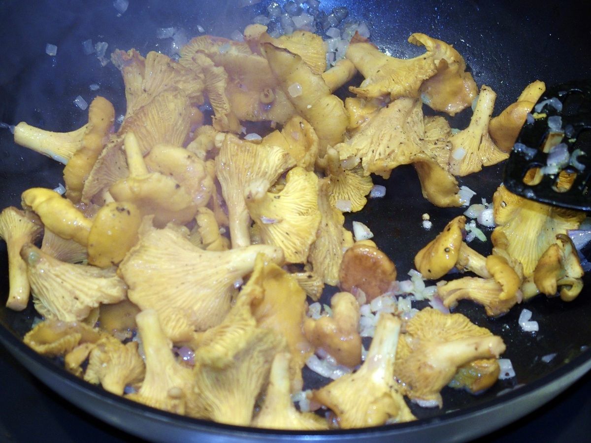 2) Dans une petite poêle, faire fondre le beurre et ajouter l’échalote hachée. Faire revenir une minute. Ajouter les chanterelles, saler et poivrer et faire revenir 2 à 3 minutes. Ajouter le vin blanc et faire réduire complètement.