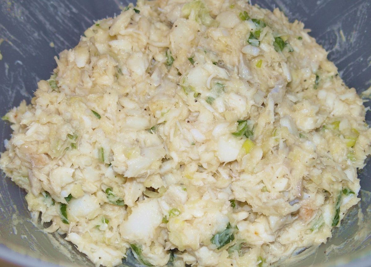 3) Ajouter 1 oeuf entier dans le saladier contenant les pommes de terre et bien mélanger. Ajouter ensuite les filets de cabillaud dans le saladier et les émietter avec une fourchette en mélangeant. Laisser quand-même de petits morceaux, pas besoin de réduire le poisson en purée! Ciseler finement les oignons nouveaux (enlever 2 à 3 cm du haut des tiges et ciseler aussi le reste des tiges). Ajouter dans le saladier. Poivrer généreusement et ajouter une pincée de paprika et 2 belles càs de farine. Ajouter une petite càc de sel. Bien mélanger. Goûter et rectifier l'assaisonnement.