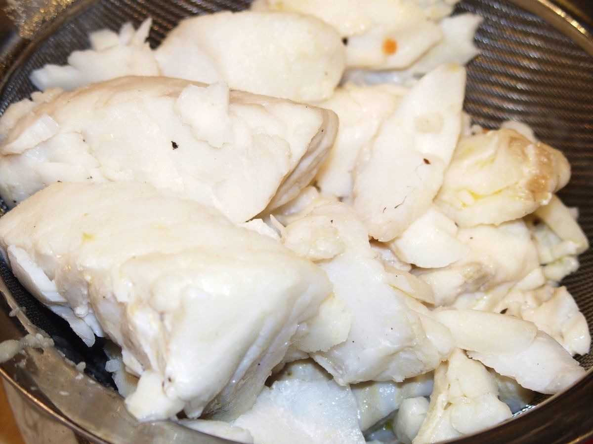 2) Parallèlement, porter à ébullition 2 litres d'eau dans une casserole avec les cubes de bouillon de légumes. Poivrer. A l'ébullition, baisser le feu et plonger les filets de cabillaud. Les faire cuire à frémissements durant 7 à 8 minutes (la chair doit se détacher toute seule) puis les égoutter et les laisser tiédir.