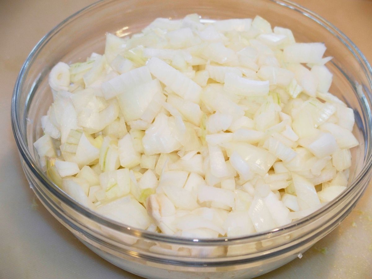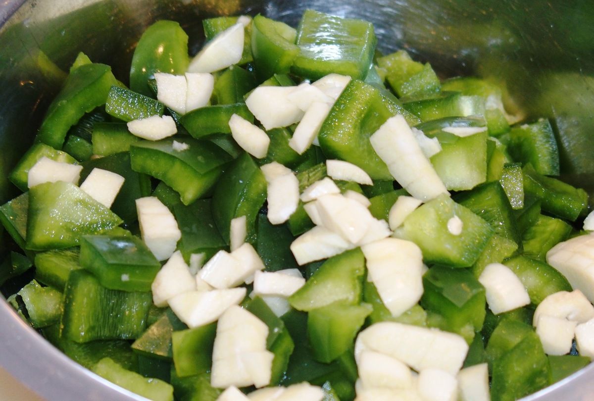 2) Hacher les oignons et réserver. Couper les poivrons en deux dans la longueur puis enlever le centre blanc avec les pépins. Découper en lanières puis en morceaux. Réserver. Hacher l'ail grossièrement et mettre avec les poivrons.