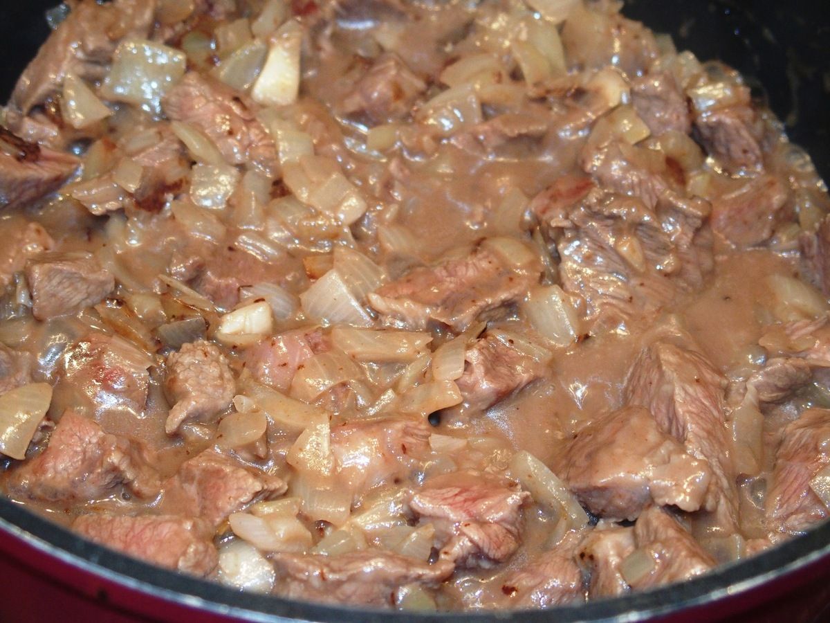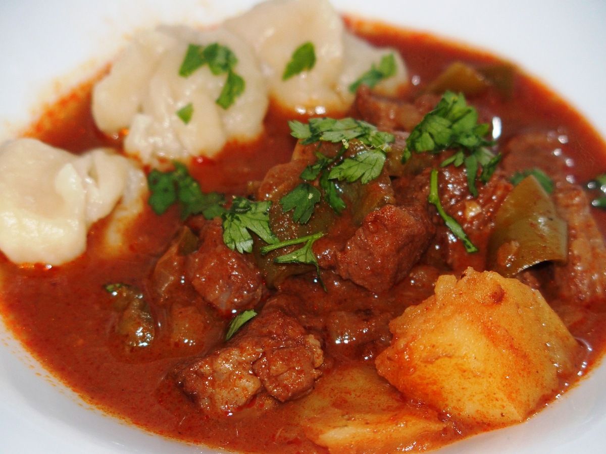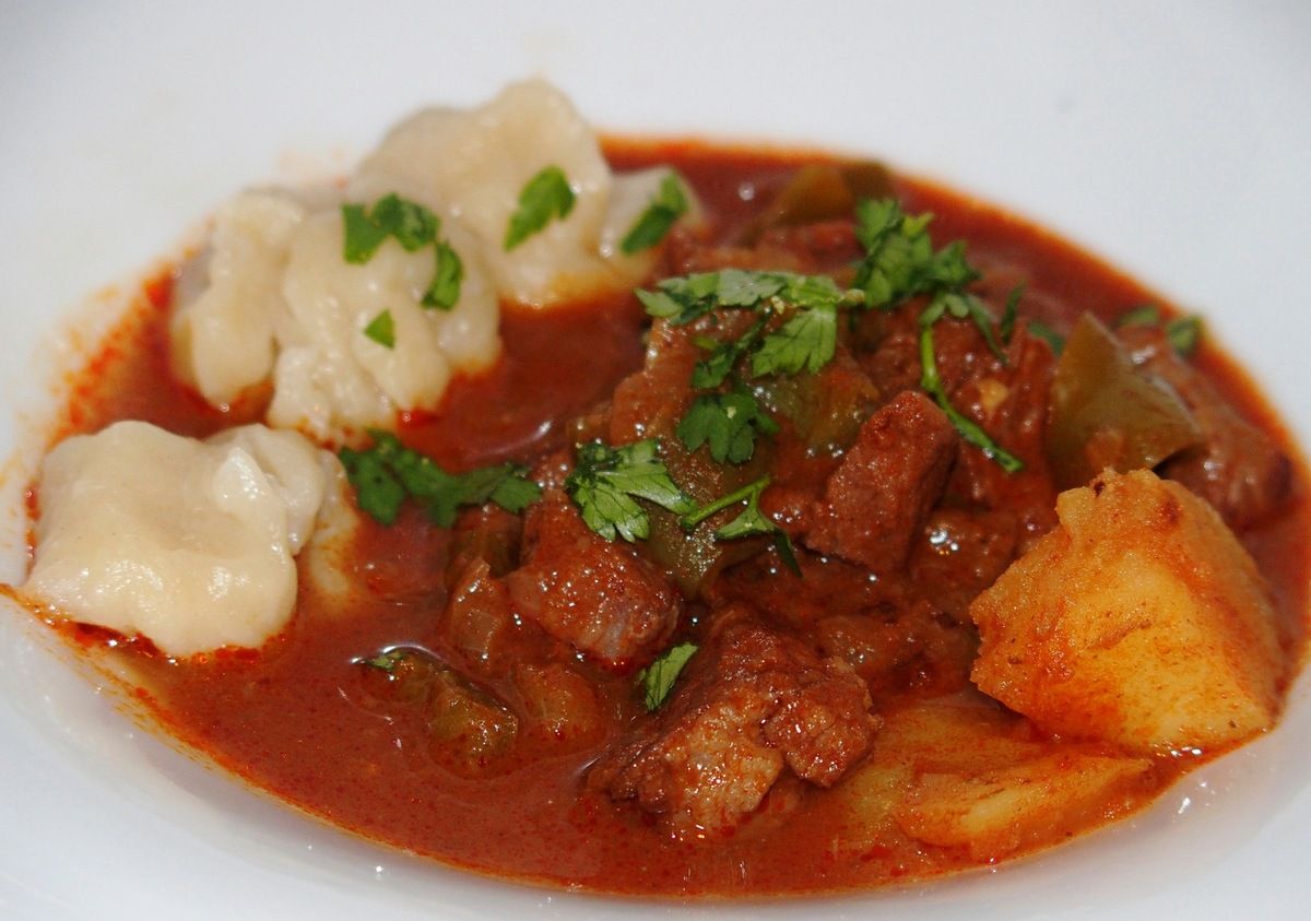 8) Servir la goulash dans des assiettes creuses en mettant d'abord la viande et les pommes de terre puis le jus. Terminer en déposant quelques Tchipetka.