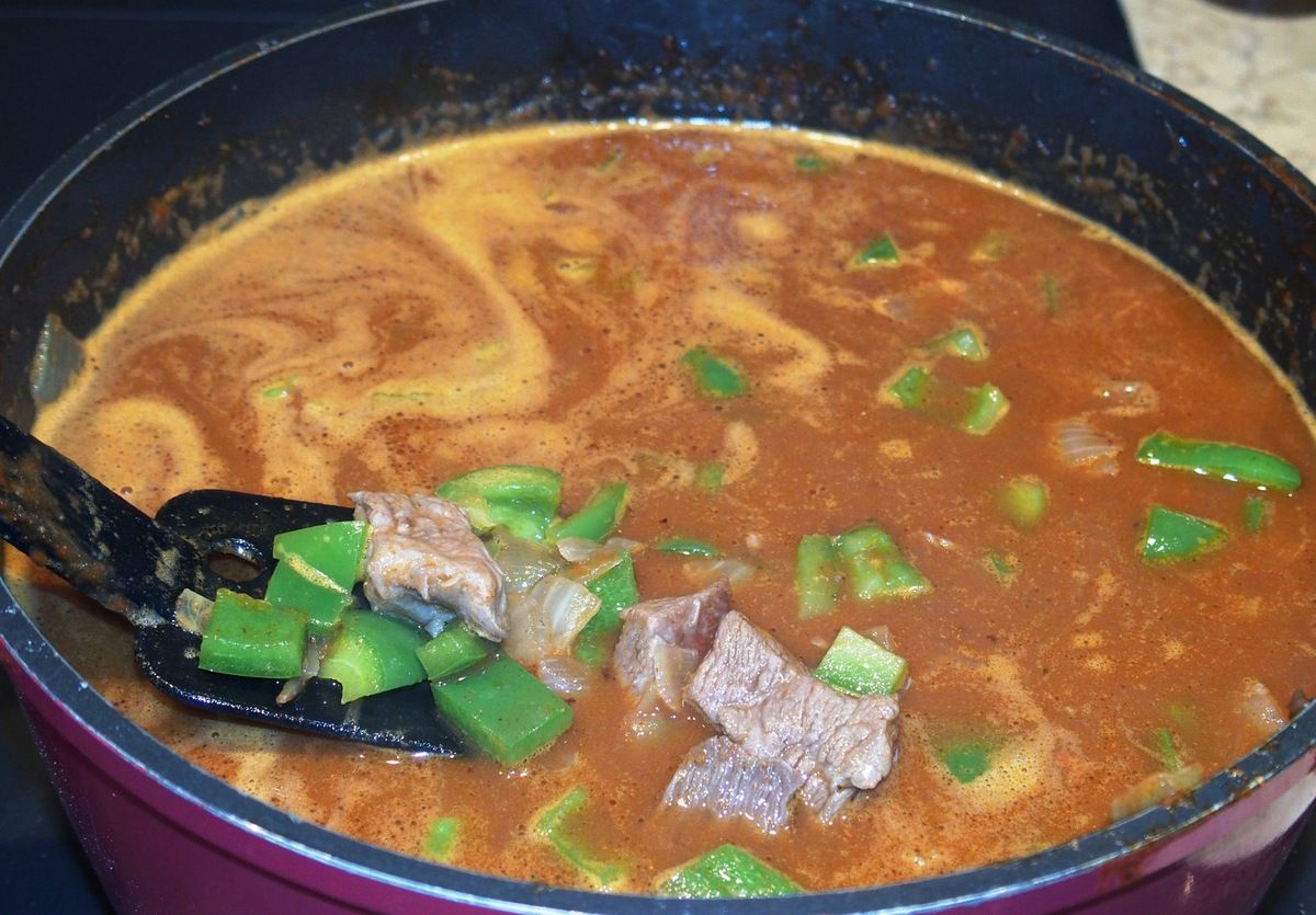 4) Ajouter le vin rouge et laisser réduire sur feu moyen de moitié. Ajouter ensuite 1 litre d'eau, le cumin et les cubes de bouillon de boeuf. Poivrer. A l'ébullition, baisser sur feu doux et couvrir. Laisser cuire 1 h30 puis découvrir, en mélangeant de temps. La viande doit être très tendre et se détacher toute seule. Si ce n'est pas le cas, prolonger encore la cuisson.
