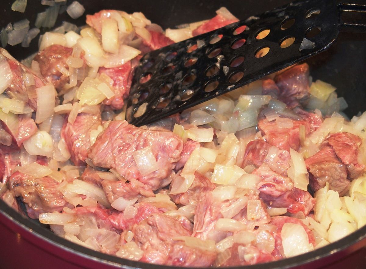 3) Dans une cocotte, mettre à chauffer un bon filet d'huile à rôtir (ou graisse de canard ou saindoux). Ajouter les oignons et les faire revenir une minute. Ajouter la viande et faire revenir jusqu'à coloration 5 à 10 minutes en mélangeant. Ajouter ensuite le concentré de tomate. Mélanger. Ajouter l'ail et les poivrons et le paprika. Faire revenir une minute.
