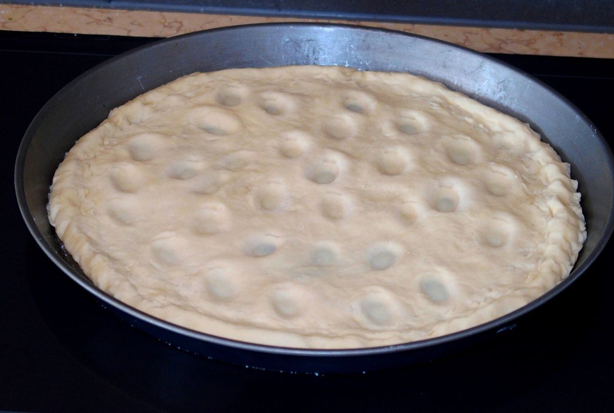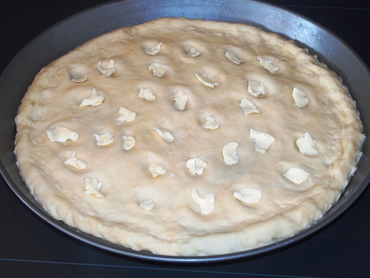 3) Après 30 minutes, mettre des petits flocons de beurre dans les cavités. Etaler la moitié de la crème sur la pâte en évitant les bords. Saupoudrer avec la moitié du sucre et enfourner pour 10 minutes.